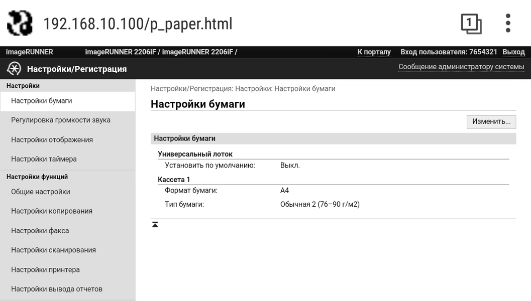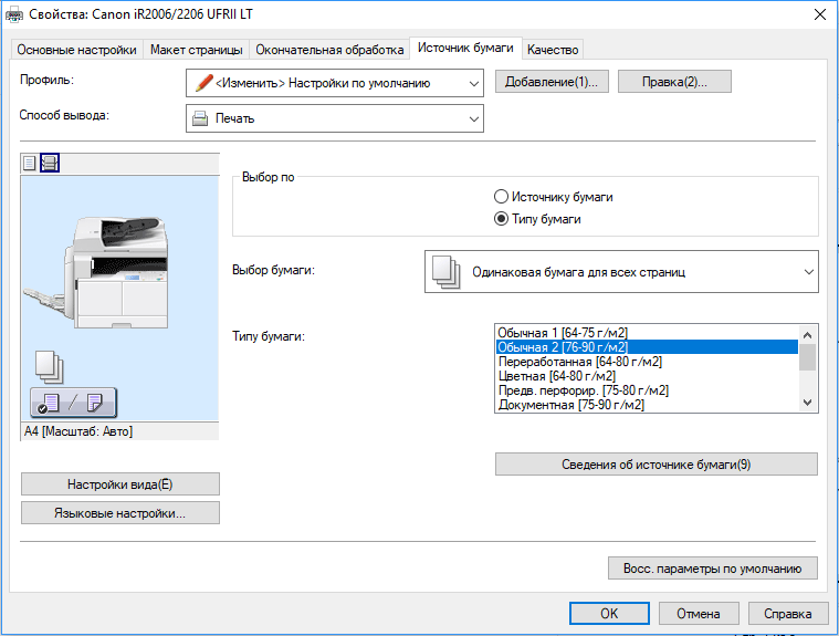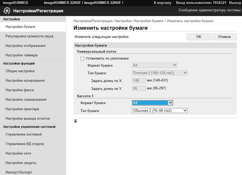 Напомним, что заявленные верхние границы диапазонов плотностей носителей невелики: для выдвижной кассеты и дуплекса до 90 г/м², для универсального лотка чуть больше — до 128 г/м². Соответственно и в настройках нельзя выставить больше.