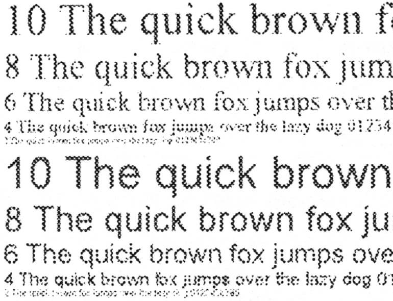 Контуры букв кеглей от 8-го довольно четкие, какие-то неровности на них можно заметить только при увеличении. Для меньших кеглей, особенно с засечками, ситуация немного хуже.