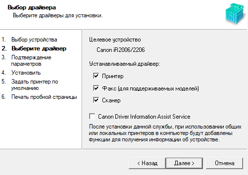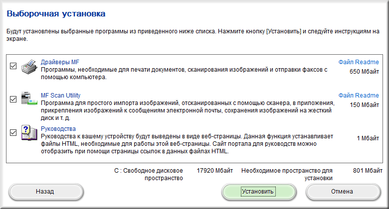 Компоненты мы устанавливали выборочно — для контроля «чего ставим», предлагаемый набор оказался вполне привычным по уже знакомым нам МФУ Canon: