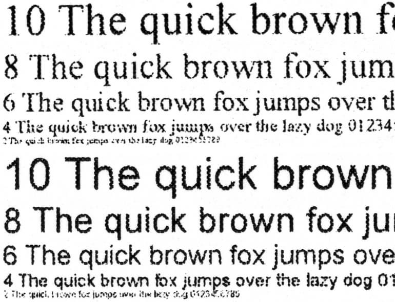 С копиями ситуация гораздо лучше: на копиях текстового оригинала, уверенная читаемость на котором начинается со 2-го кегля, можно даже разобрать 2-й кегль шрифта без засечек, хоть и с трудом, а 4-й кегль в любом случае читается хорошо.
