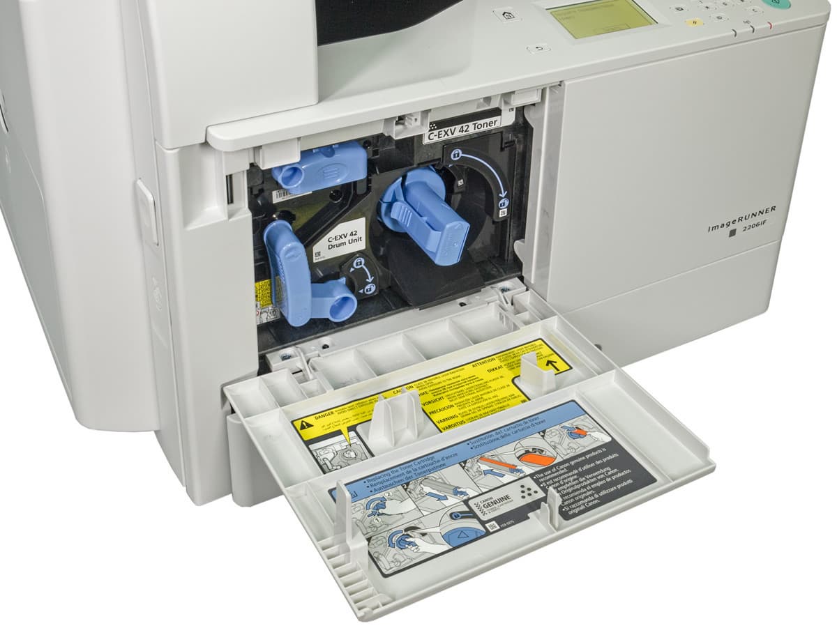 Компоновка в целом вполне обычная для подобных устройств, разве что «повёрнутая»: у печатающих устройств формата А3 (и Canon, и других производителей) отпечаток в приемный лоток чаще всего выходит справа налево, а в iR 2206 наоборот — слева направо. Соответственно и некоторые органы тоже имеют «зеркальное» расположение или конфигурацию по сравнению со многими аналогами.