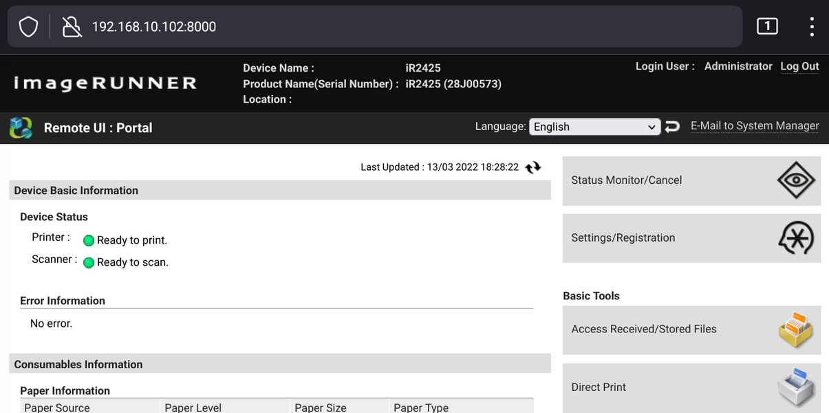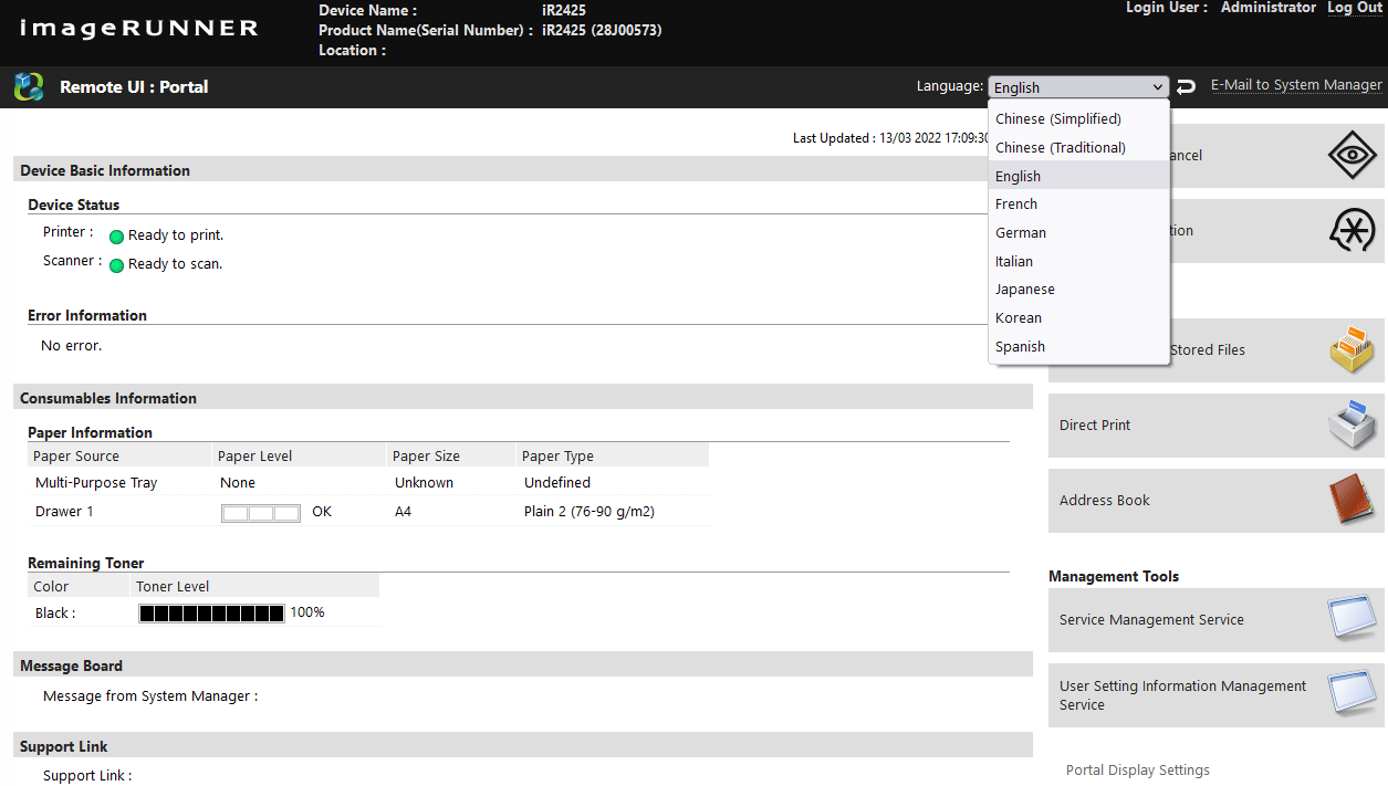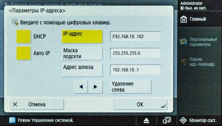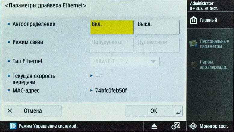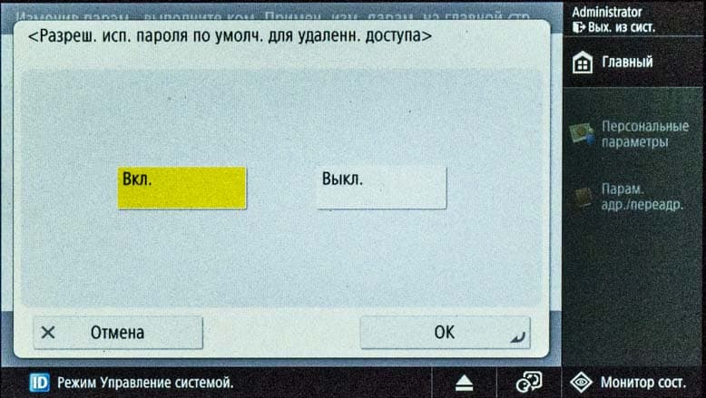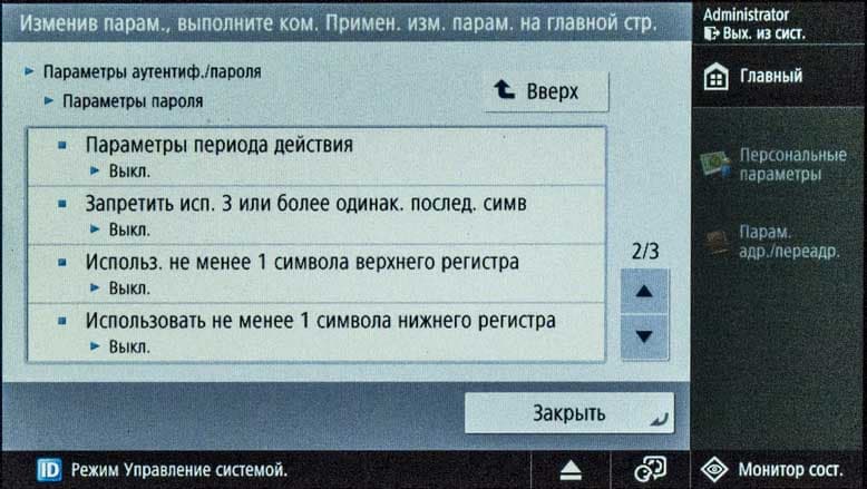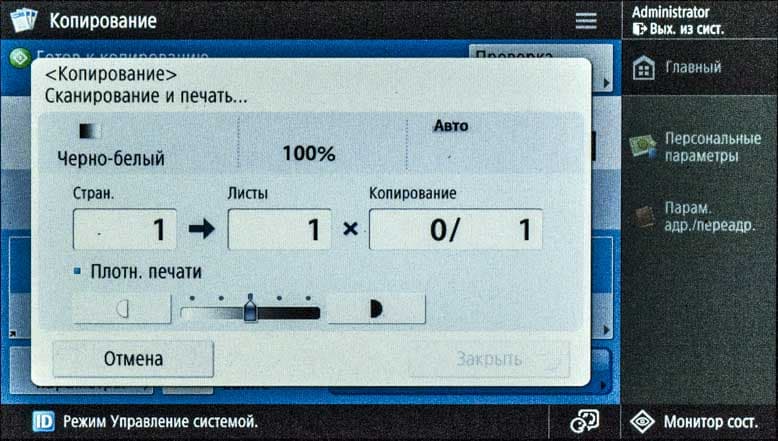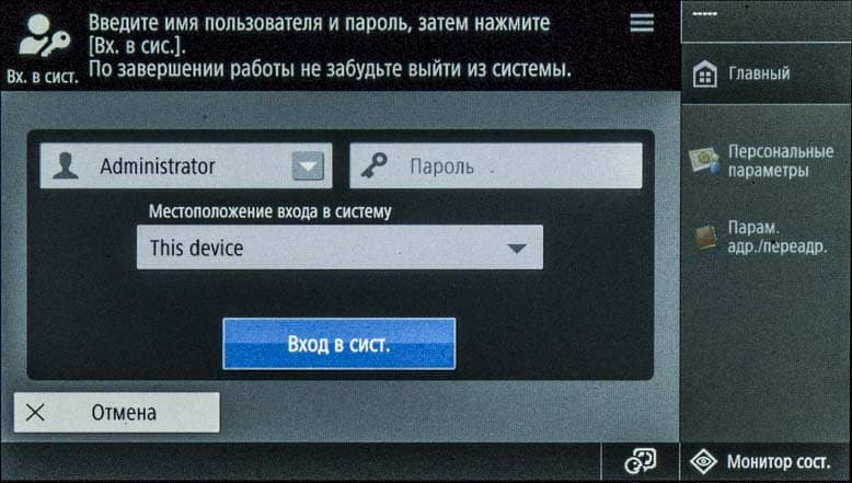 Но для этого потребуется войти в систему, в общем случае — с правами администратора. Логин и пароль, установленные по умолчанию, указаны в инструкции: Administrator и 7654321, и каждый раз при попытке входа будет возникать предложение сменить этот пароль для повышения безопасности. В нашем экземпляре МФУ безопасность уже повысили, но, как водится, новый пароль сообщить нам забыли. Тем не менее, методика сброса пароля легко доступна в интернете.