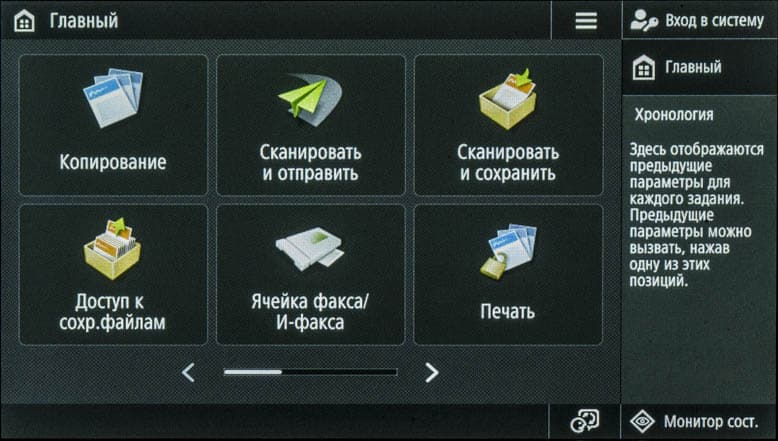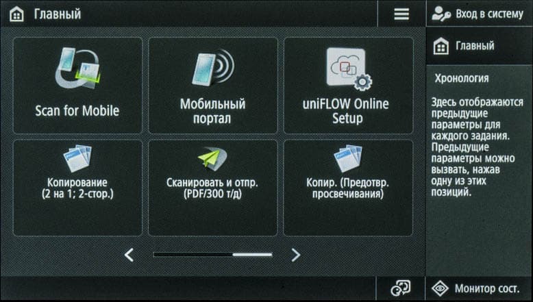 Главный экран меню состоит из четырех страниц с крупными кнопками для основных операций и их вариаций вроде «Копирование (2 на 1, 2-стор.)».