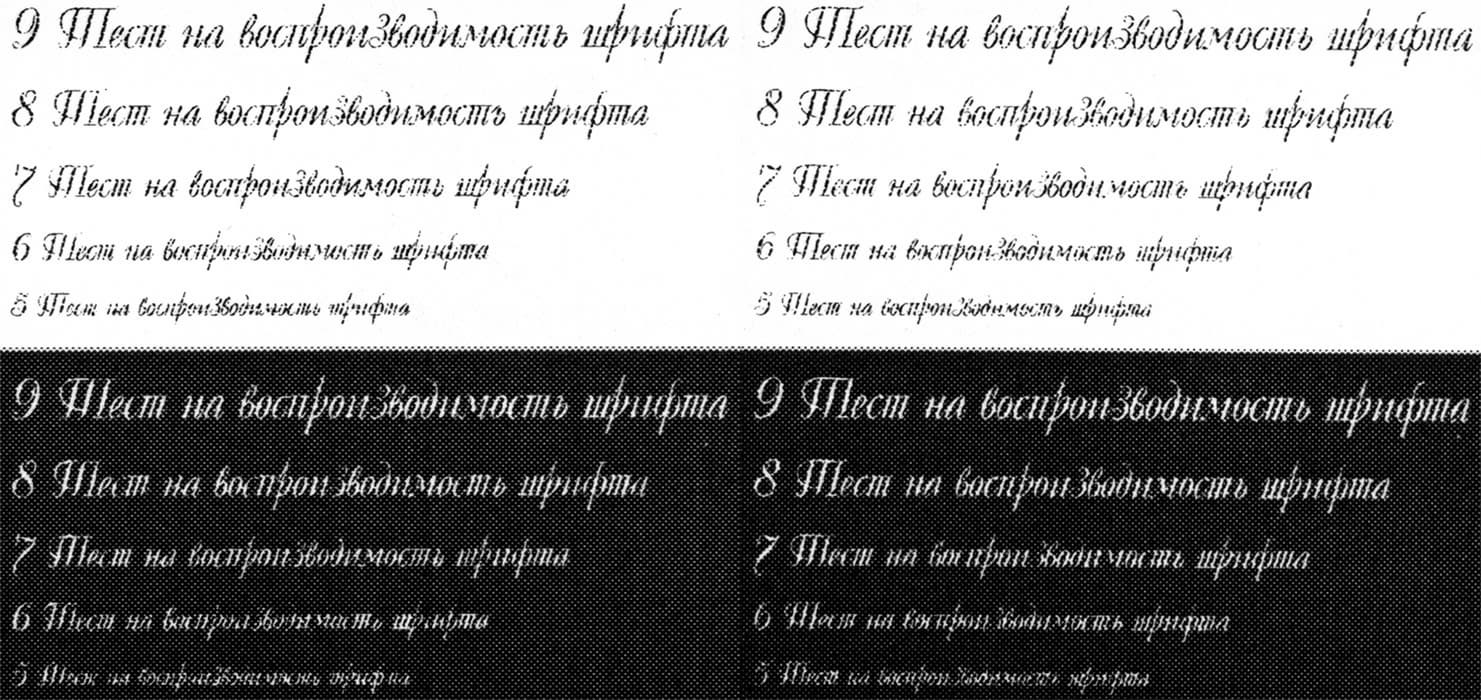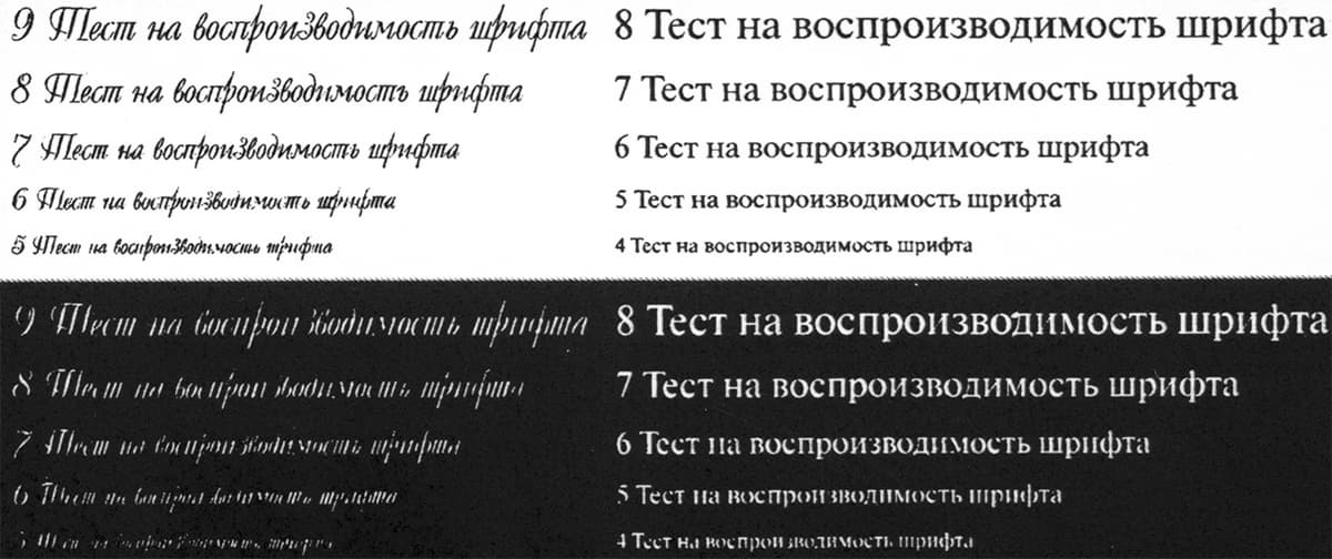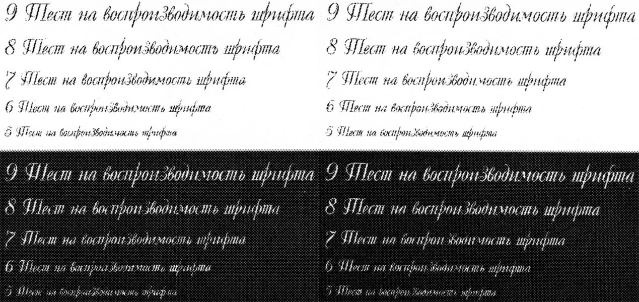 Однако растр заметен меньше, чем при печати, и читаемость текстового блока лучше: на участках с нормальной печатью даже декоративный шрифт различим от 7 кегля, а обычные шрифты и вовсе с 4-го; для выворотки читаемость похуже, но лучше, чем при печати.