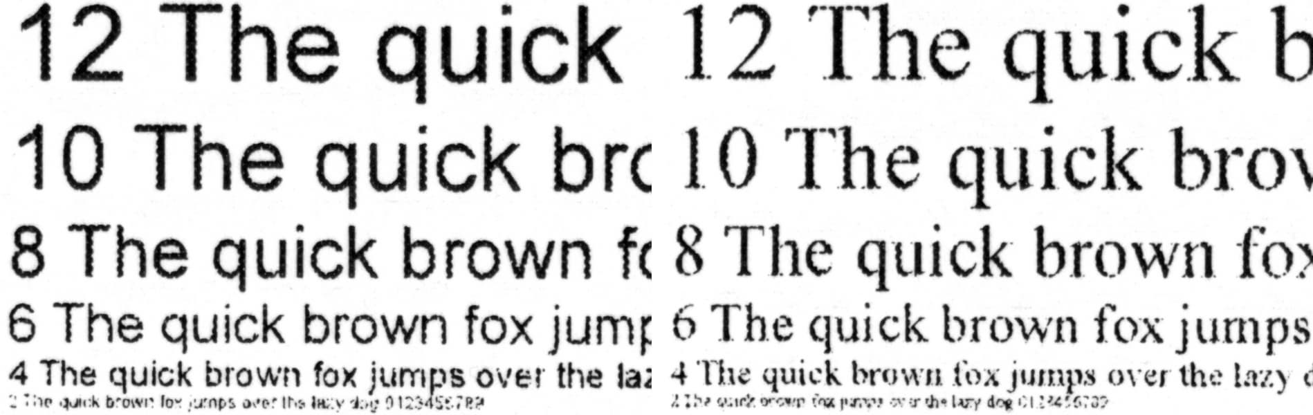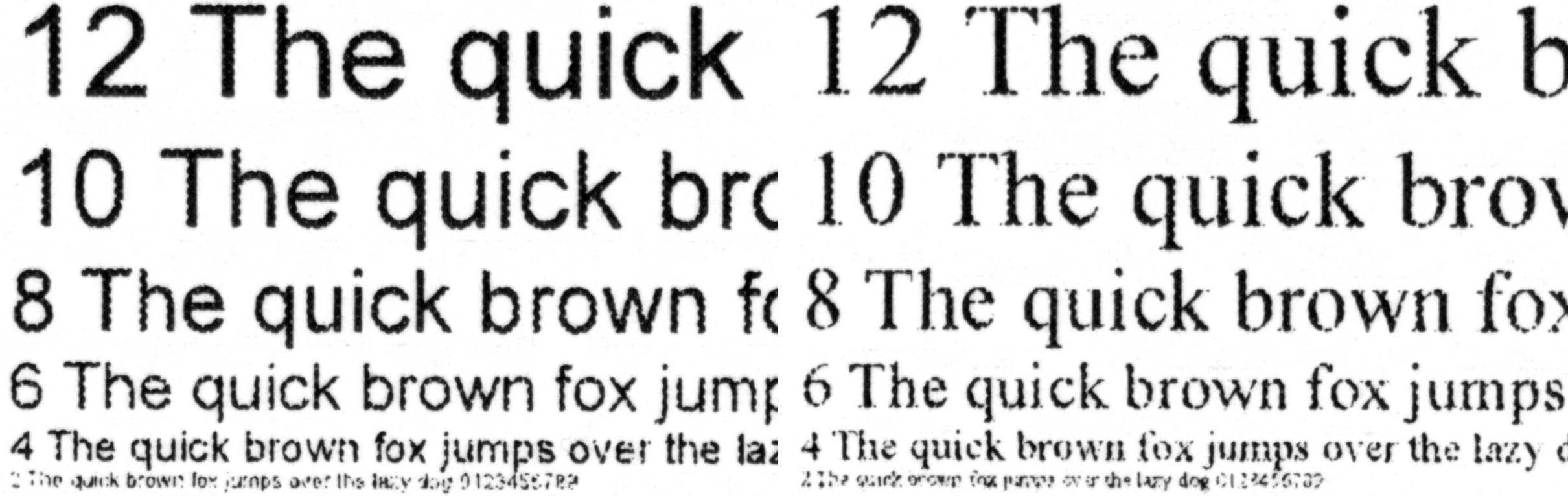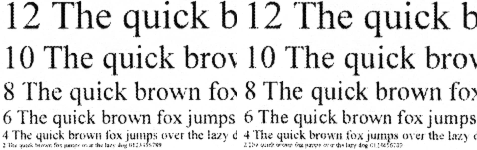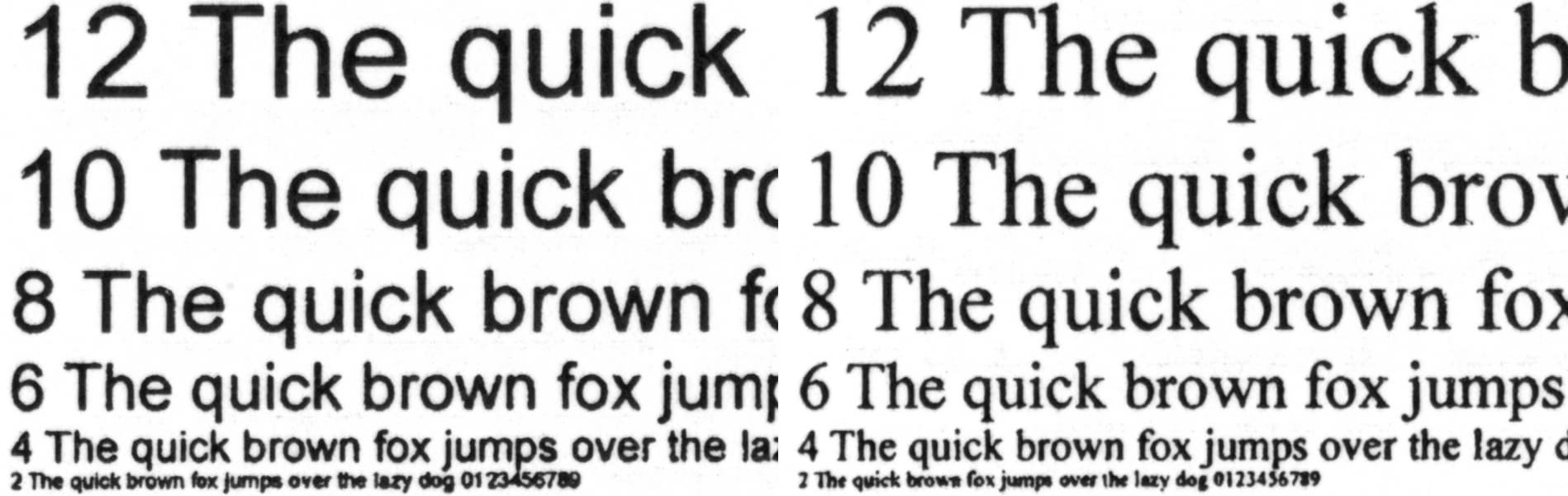 С копиями ситуация гораздо лучше: на копиях текстового оригинала, уверенная читаемость на котором начинается со 2-го кегля, можно даже разобрать 2-й кегль шрифта без засечек, хоть и с трудом, а 4-й кегль в любом случае читается хорошо.