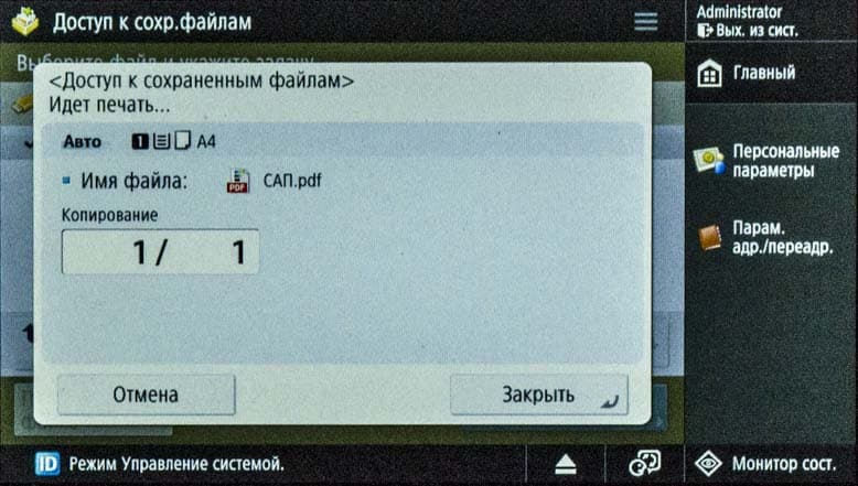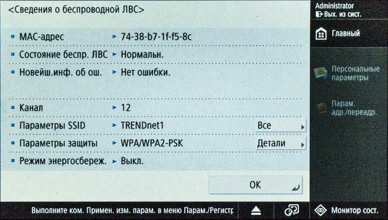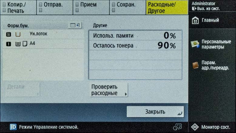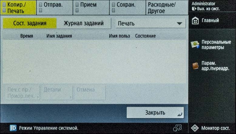 Экранная кнопка «Монитор сост.» отобразит сведения о заданиях — текущих, выполненных, сохраненных, а также об использовании памяти и о расходных материалах.