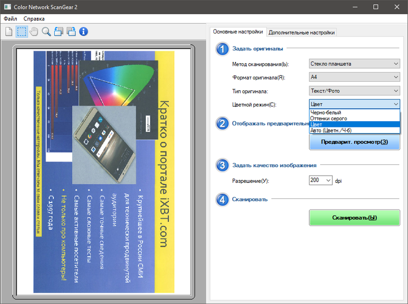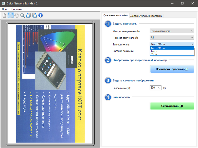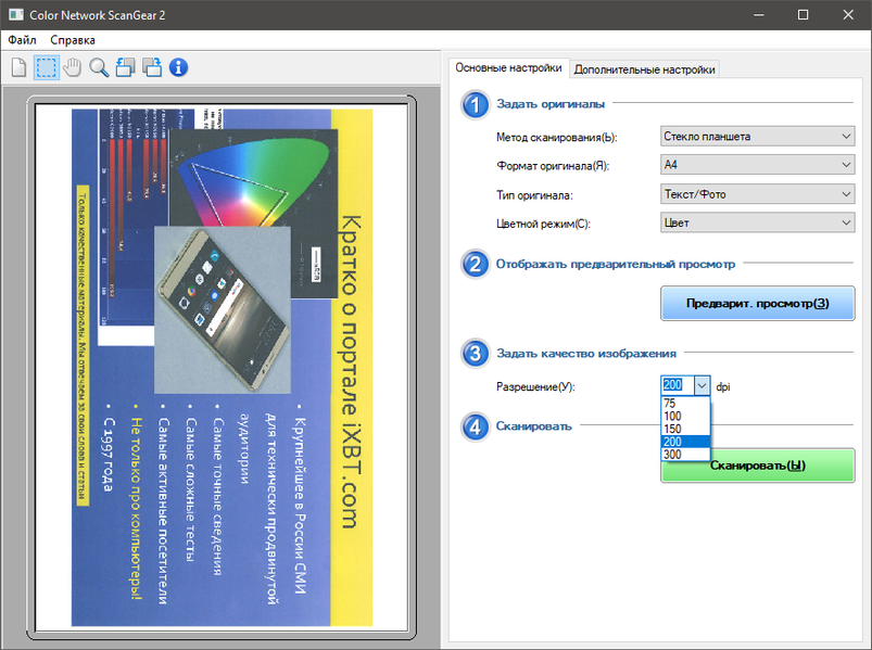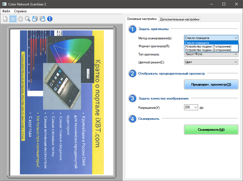 Использовался пакет из 20 листов А4, подаваемых длинной стороной с помощью АПД.