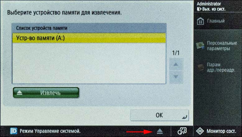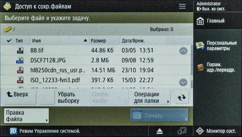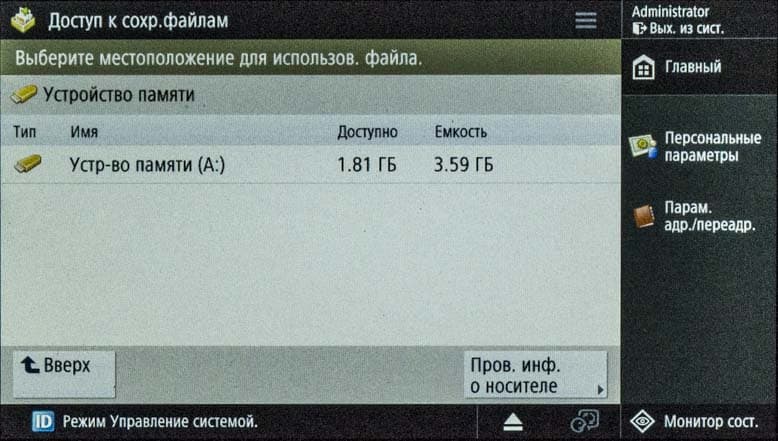 Назначение порта USB-B(f) понятно: для локального подключения к компьютеру, а к разъему USB-A(f) на правой боковой стенке, как и к тому, что в левой части панели управления, подключаются запоминающие устройства, причем не только флешки, но и жесткие диски — по крайней мере, они упомянуты в инструкции. Кроме того, возможно подключение USB-клавиатуры для более удобного ввода символов.