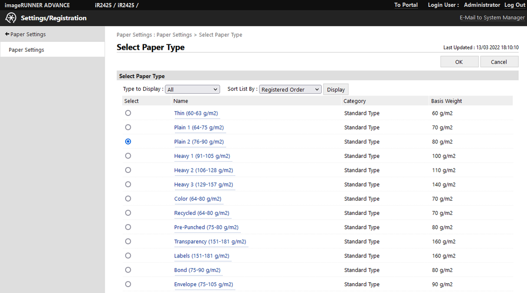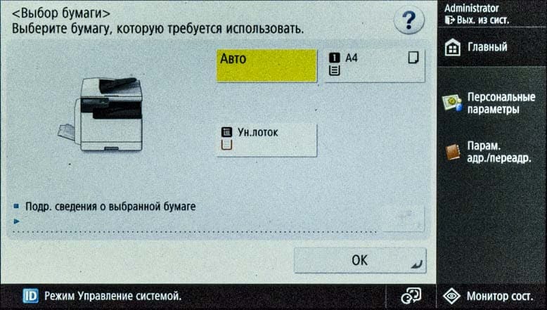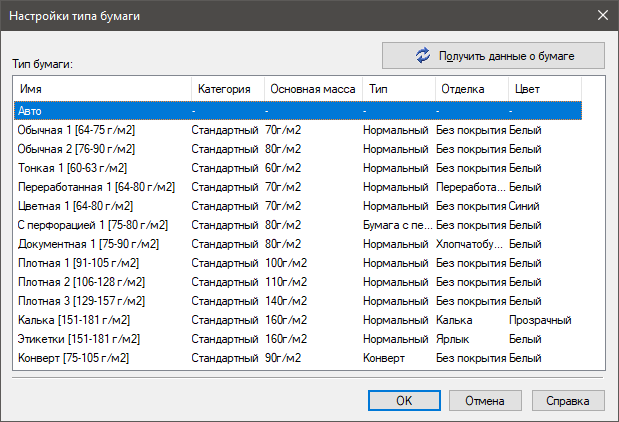 Напомним, что заявленные верхние границы диапазонов плотностей носителей невелики: для выдвижной кассеты и дуплекса до 90 г/м², для универсального лотка побольше — до 157 г/м². Соответственно и в настройках нельзя выставить больше, хотя для некоторых типов носителей (калька, этикетки) указывается и 181 г/м²