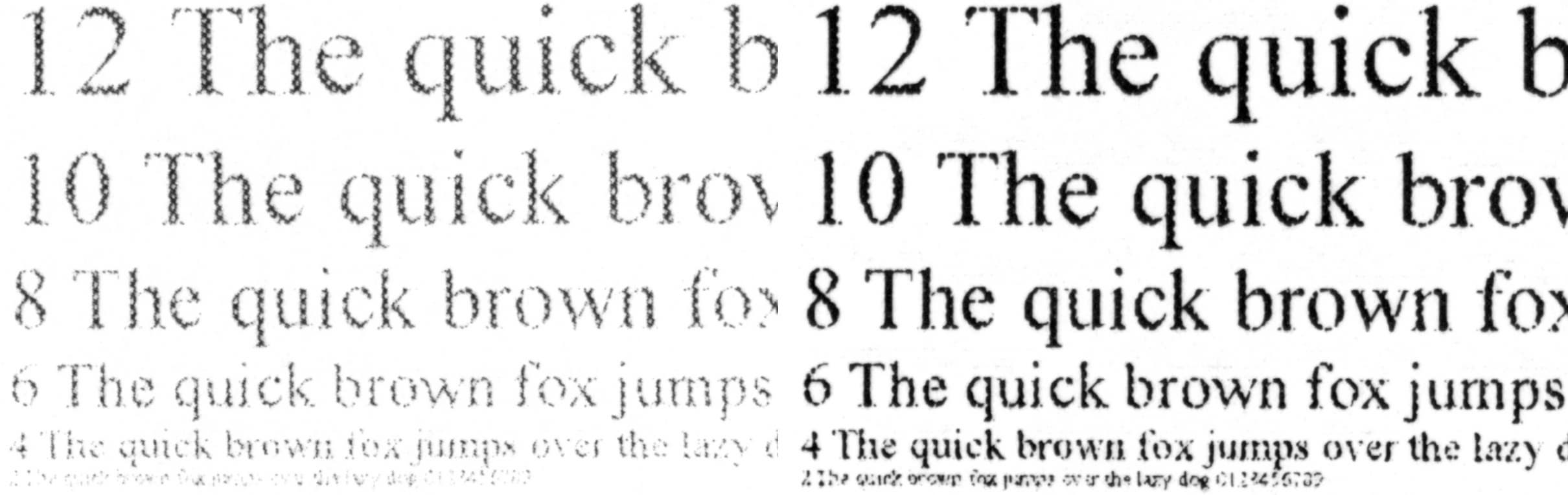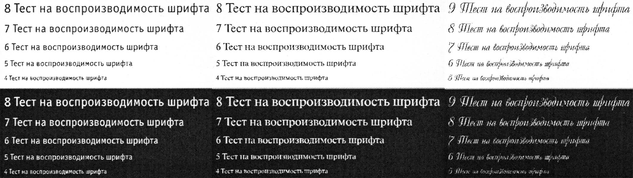 При печати передачу текстовых образцов выдающейся не назовешь: уверенная разборчивость начинается с 6-го кегля для шрифтов обоих видов; для шрифтов без засечек условно читаемым можно назвать 4-й кегль, с засечками он читается плохо.