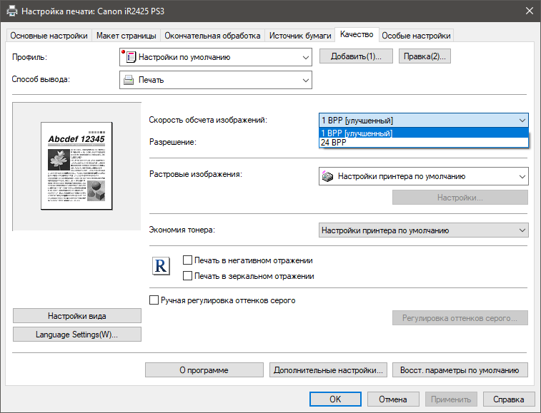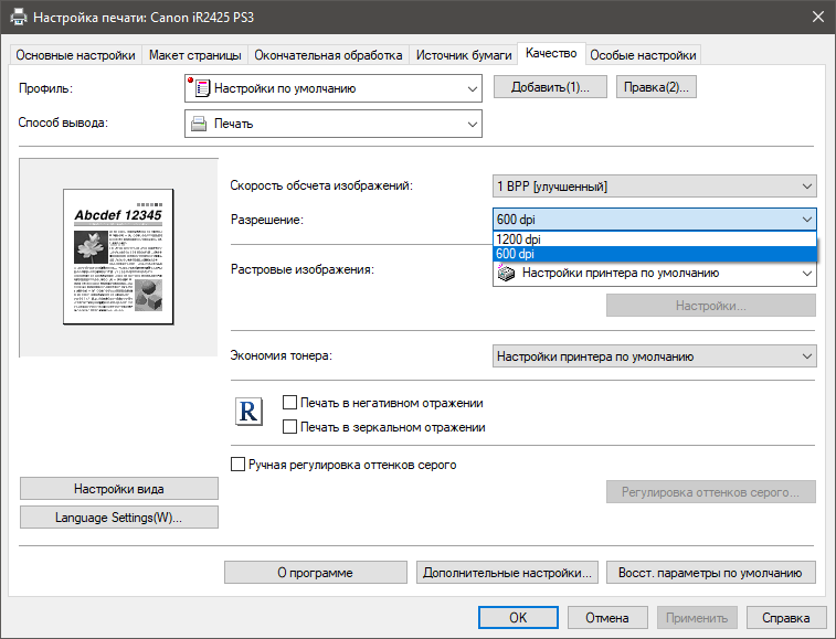 Повышение разрешения также не дает увеличения качества, а скорость снижает, то есть и для смешанных документов рекомендовать печать с 1200 dpi мы не будем.