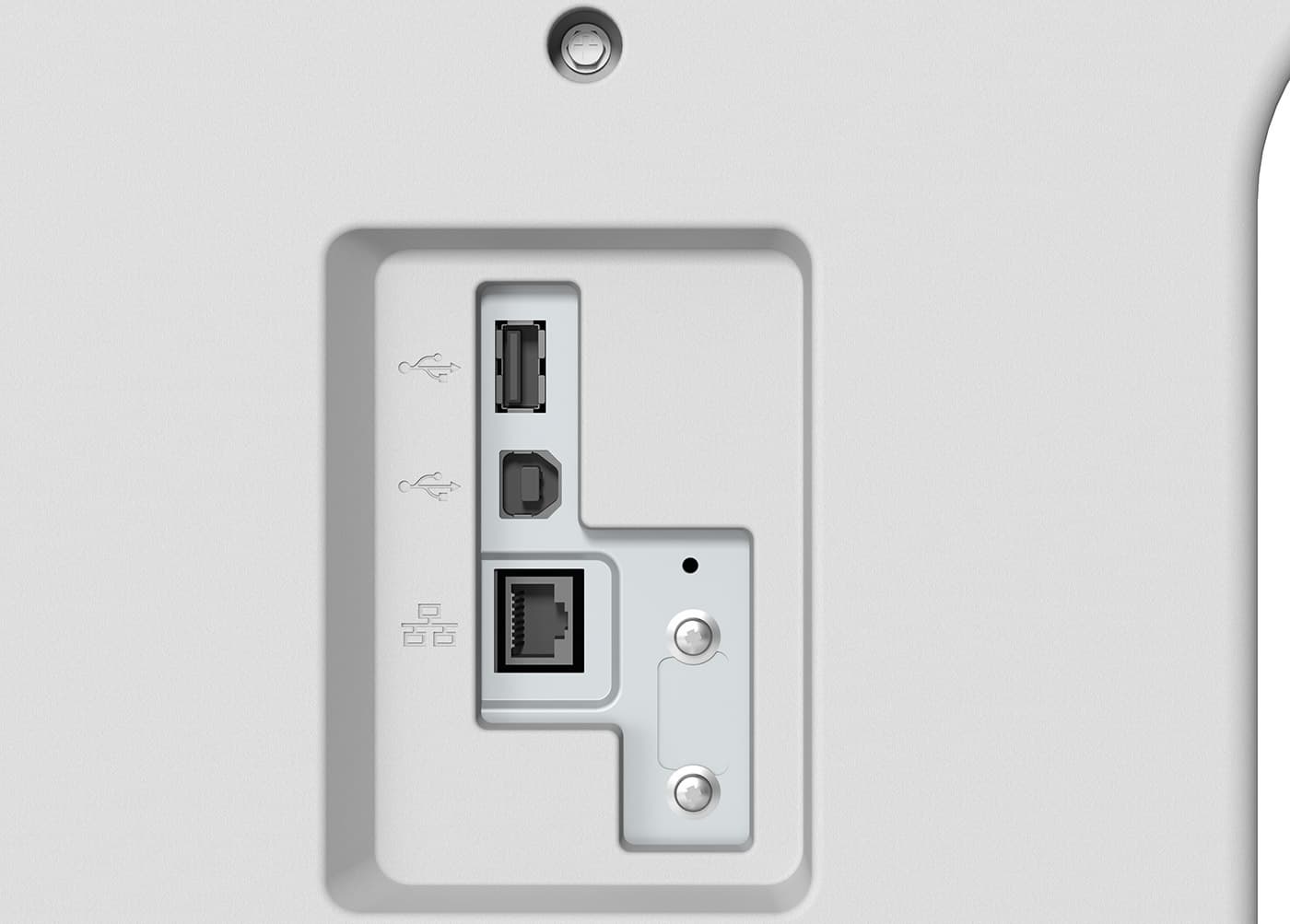 Все разъемы находятся на правом боку аппарата, их не так много: сзади повыше — порты USB-A(f), USB-B(f) и Ethernet, пониже и в середине — разъем для кабеля питания, ближе к передней стенке — выключатель Power под прозрачной крышечкой.