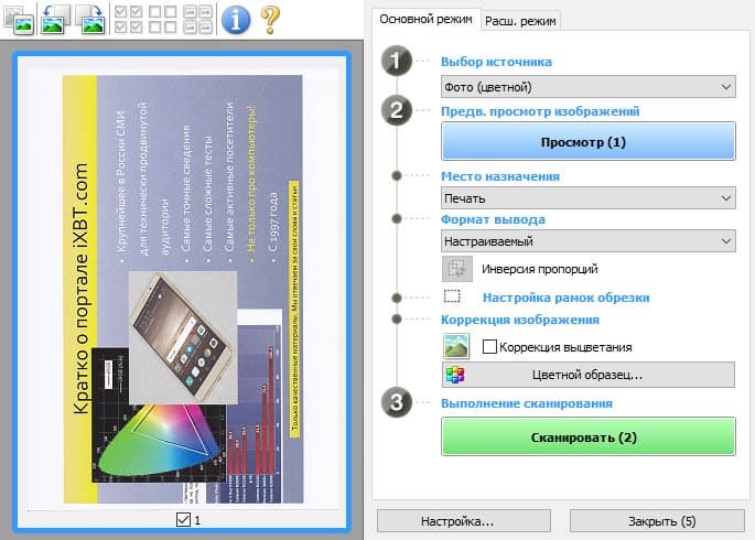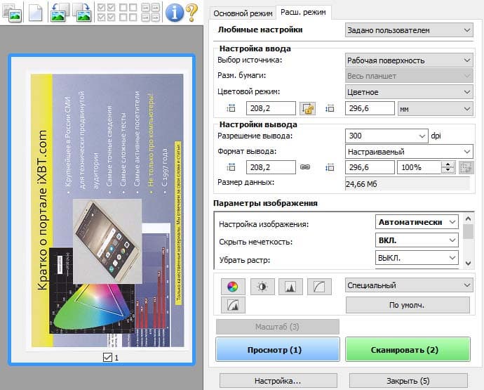 Регулировать интенсивность на комбинированных документах, особенно содержащих фотоиллюстрации, нужно с осторожностью: так, можно получить отлично читаемые тексты, но при этом фотографиии станут темными и малоконтрастными, к тому же может появиться фон. Установка «Авто» в таких случаях не способна дать оптимальное качество для всех элементов документа.