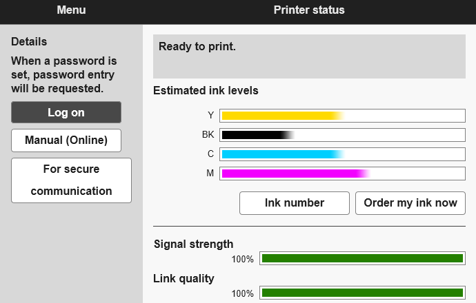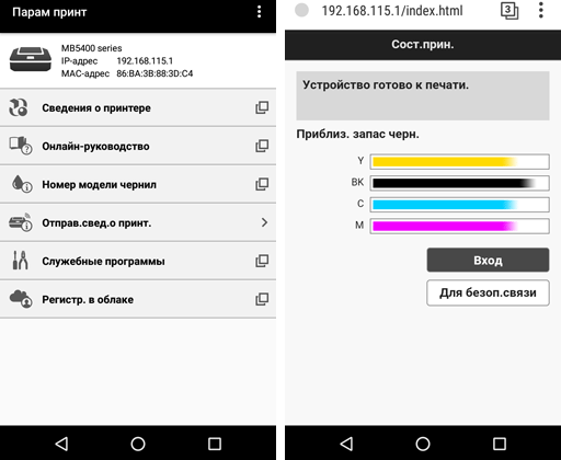 Кроме того, внизу есть значки поменьше — для подключения к сети, уровня чернил и настроек подающих кассет; нажатие на них вызывает соответствующие экраны с состоянием или настройками. Жесты вертикальной прокрутки используются в разного рода подменю.