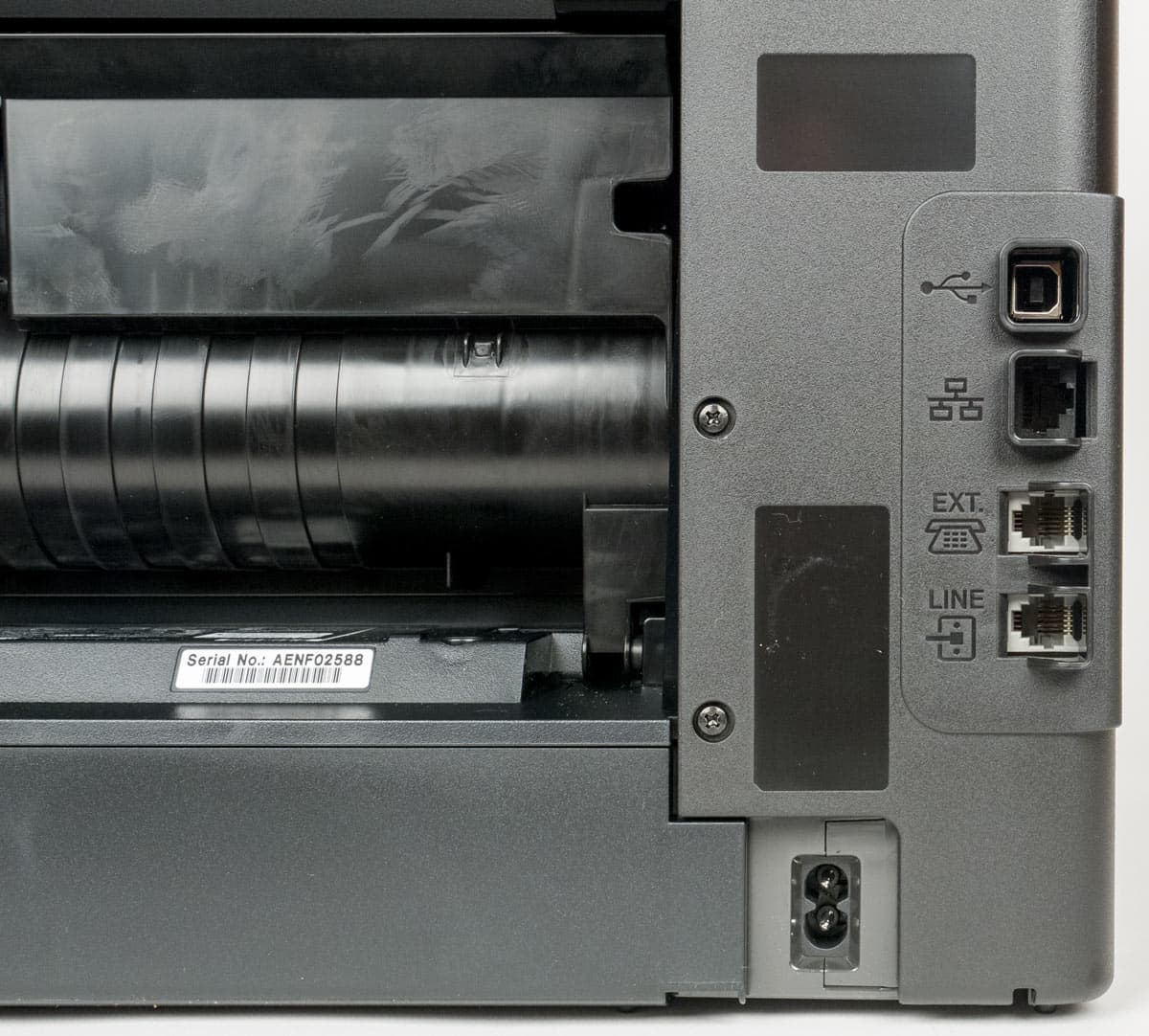 Все разъемы находятся сзади слева (относительно лицевой панели): в самом низу гнездо питания, выше два телефонных, для линии и дополнительного аппарата, затем коннектор LAN и порт USB типа B.