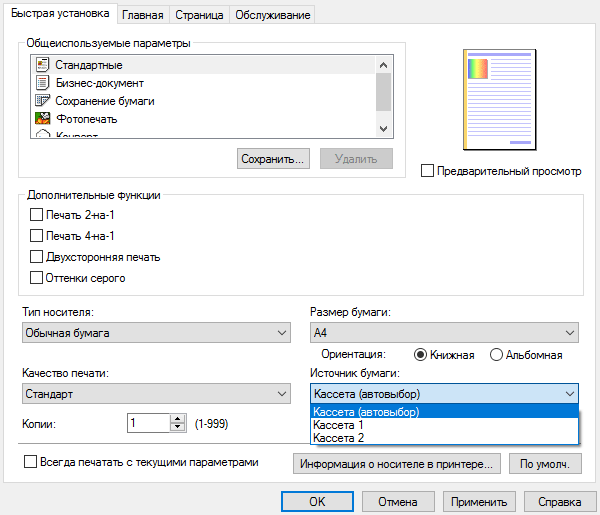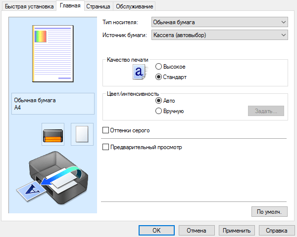Фотобумаги Canon формата А4 у нас не было, печать проводилась на офисной бумаге класса А с установкой в настройках «Обычная бумага».