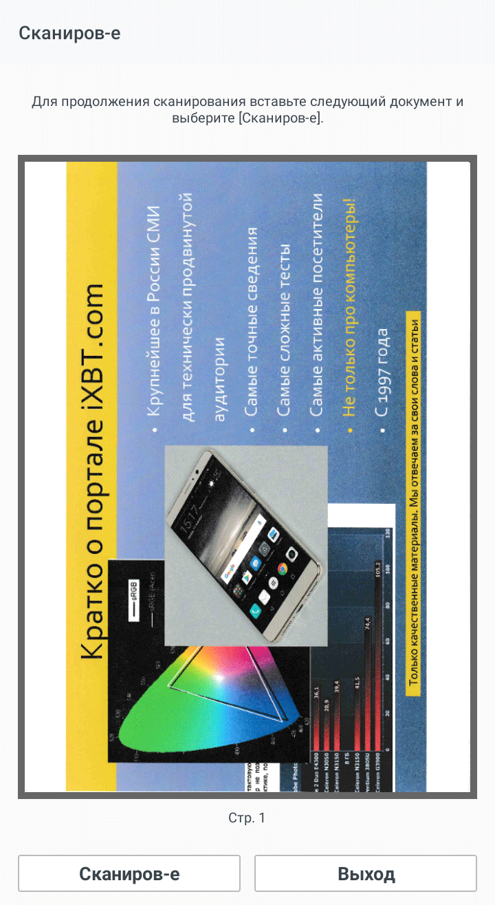 Поскольку автоподатчика в МФУ нет, вариант для сканирования единственный — со стекла. Его мы опробовали при разных вариантах подключения, замер времени — от нажатия кнопки «Сканировать» в ScanGear до появления скана в окне приложения, различные улучшения средствами драйвера отключены.