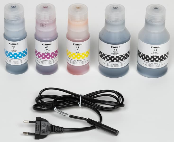Как и в других моделях линейки «Формула выгодной печати», черные чернила пигментные, цветные — водорастворимые. Нам уже встречались контейнеры GI-40 и GI-490, здесь видим еще один вариант — GI-41; сами чернила вряд ли отличаются (хотя однозначно утверждать нельзя), а вот контейнеры-бутылочки немного разные.