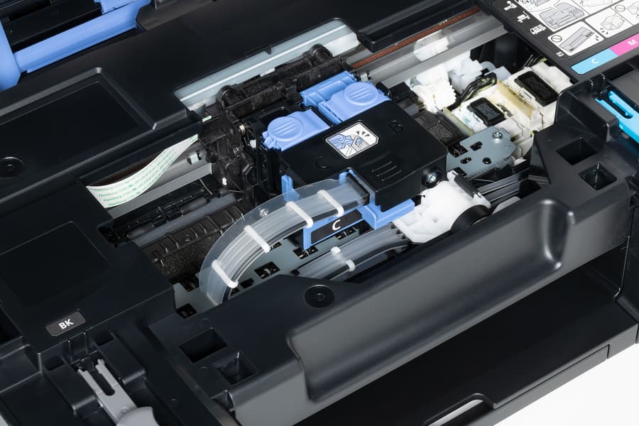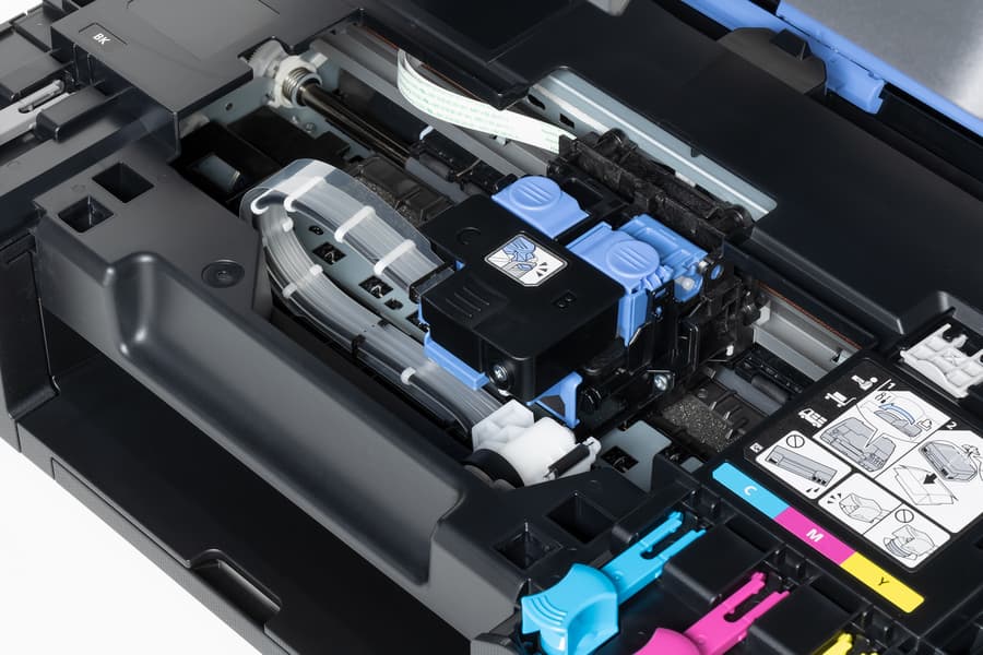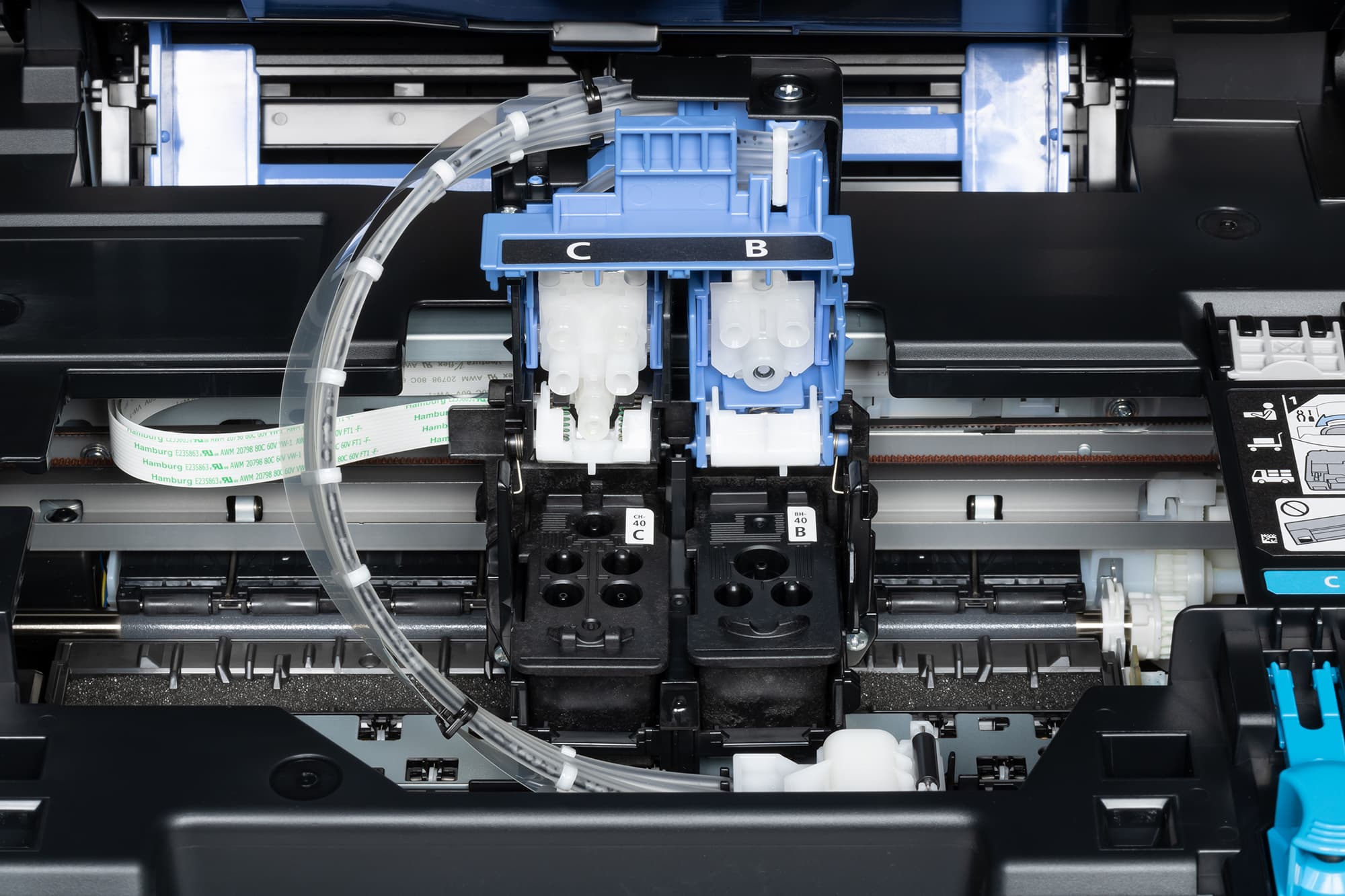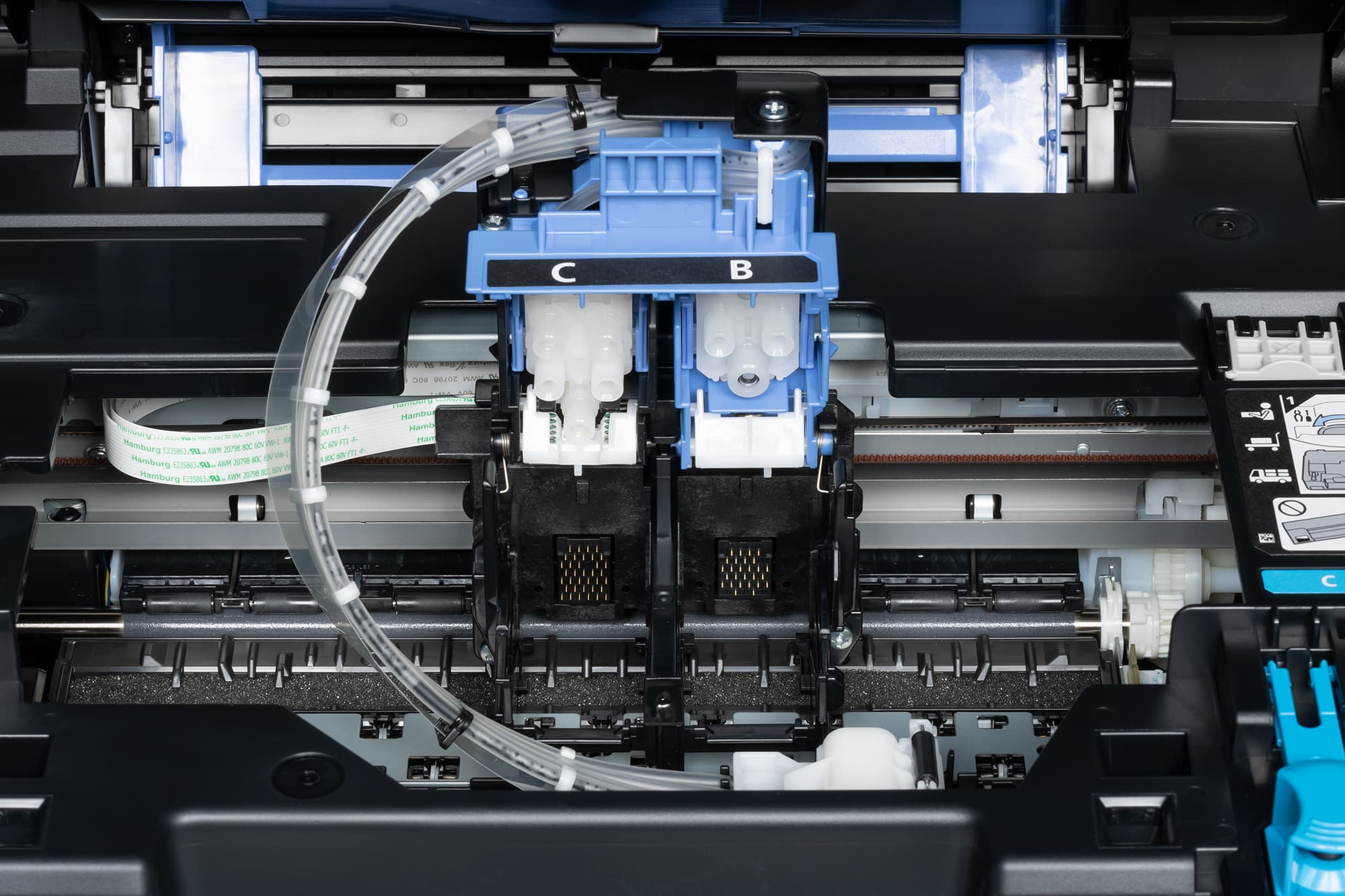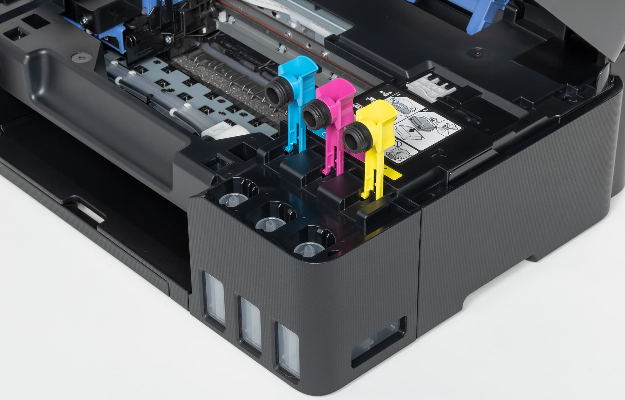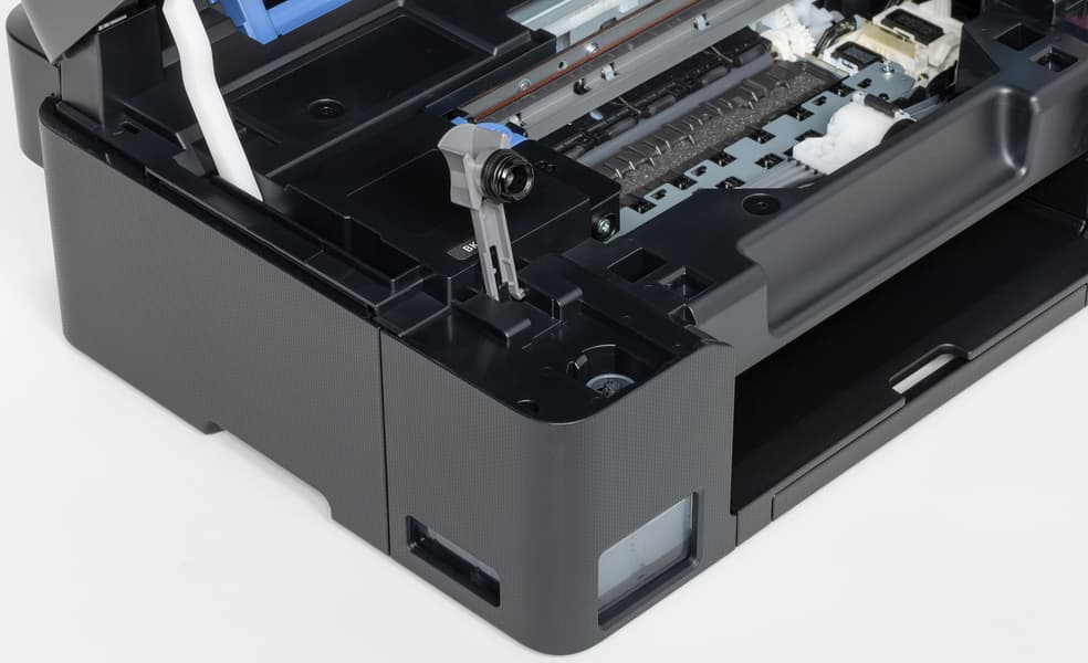 Верхняя часть МФУ откидывается вверх на угол около 40° с фиксацией в открытом состоянии, предоставляя доступ к узлам и механизмам принтера, а также к встроенным емкостям: слева находится один большой контейнер для черных чернил, а справа три поменьше для цветных.