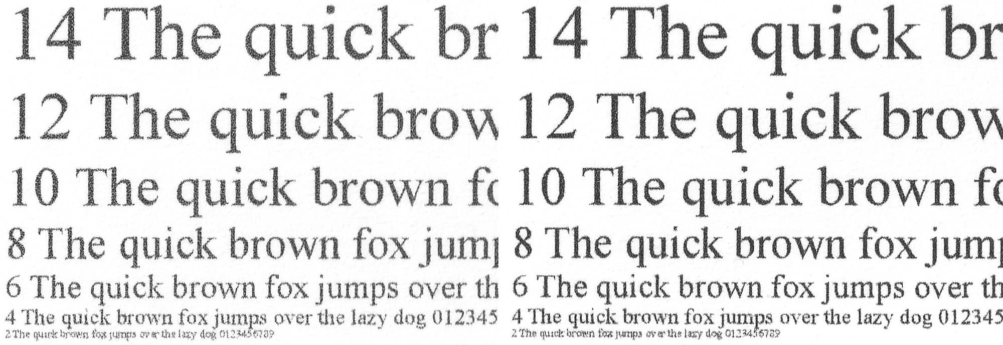 Отпечаток текстового образца, сделанный с высоким качеством, выглядит практически так же, лишь при тщательном непосредственном сравнении видно, что заливка на нем чуть более плотная.