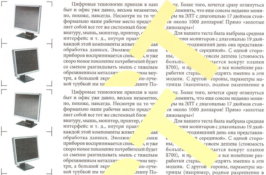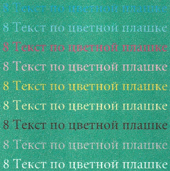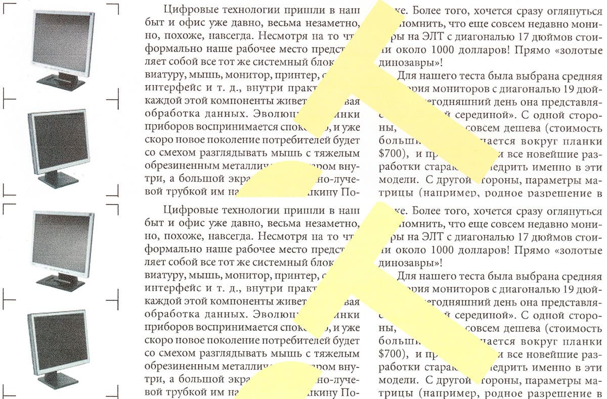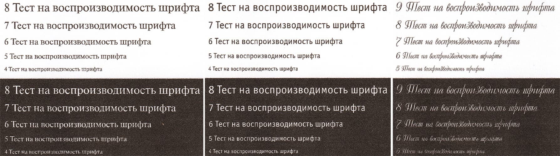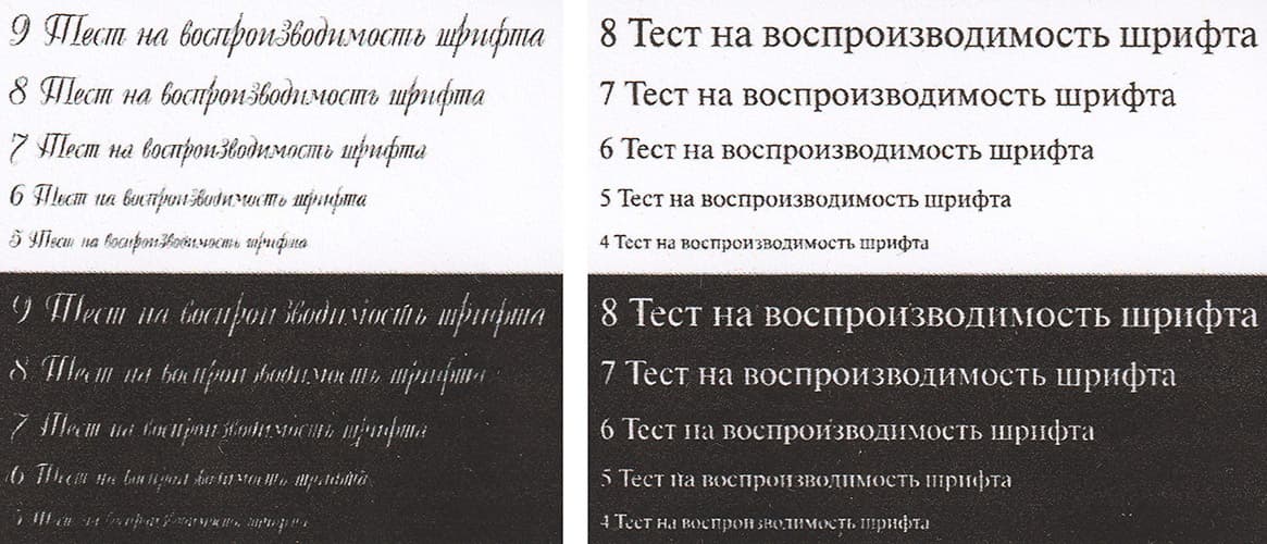 Текстовые поля воспроизводятся неплохо: при печати нормальной и вывороткой шрифты с засечками и без читаются от 4-го кегля, разве что с засечками с некоторым трудом. Декоративный шрифт реально читается с кеглем от 5-го нормальный и от 7-го вывороткой.