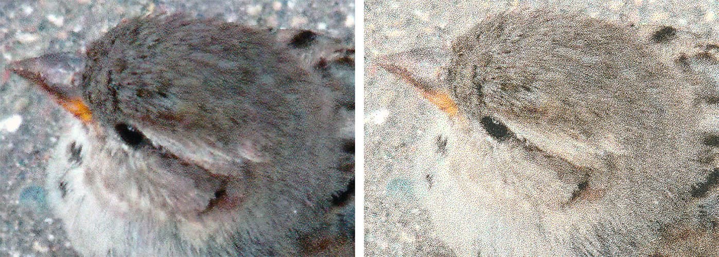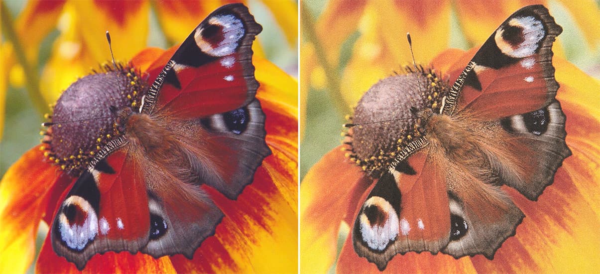 Отличия также очень существенные: на правом отпечатке заметен растр, мешающий передаче самых мелких элементов фотоизображения. Кроме того, ощутима разница в цветопередаче.