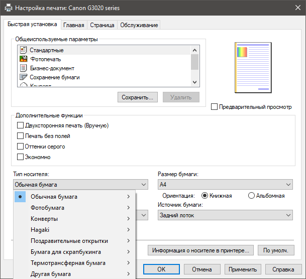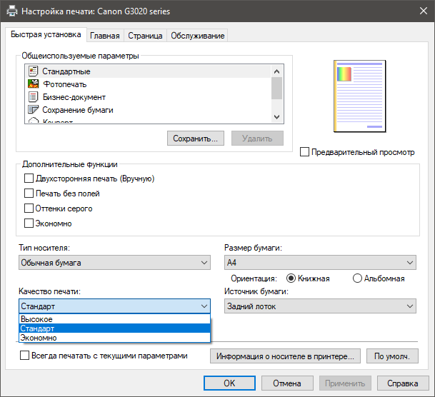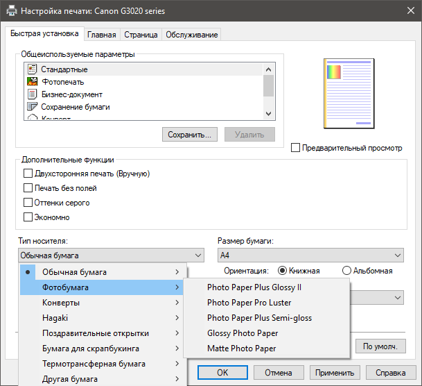 Дополнительные установки: опробуем влияние на скорость использования фотобумаги (ее роль играла бумага Canon Photo Paper Plus Semi-gloss плотностью 260 г/м², в настройках задан соответствующий тип носителя) и еще раз оценим бесшумный режим при печати фотографий с разными установками качества.