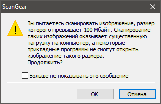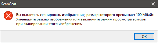 При попытке установить разрешение 1200 dpi (в цвете и в оттенках серого) результирующий размер данных превышает 100 мегабайт, и вместо сканирования лишь появляется такое сообщение: