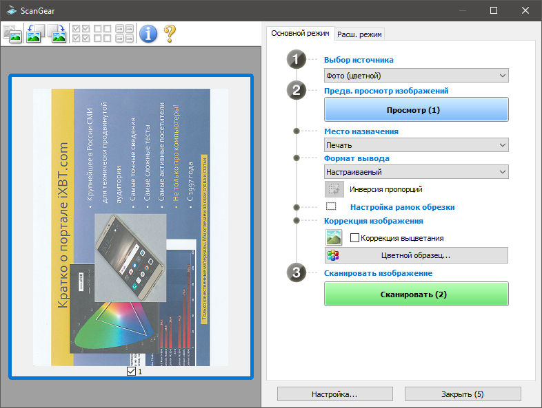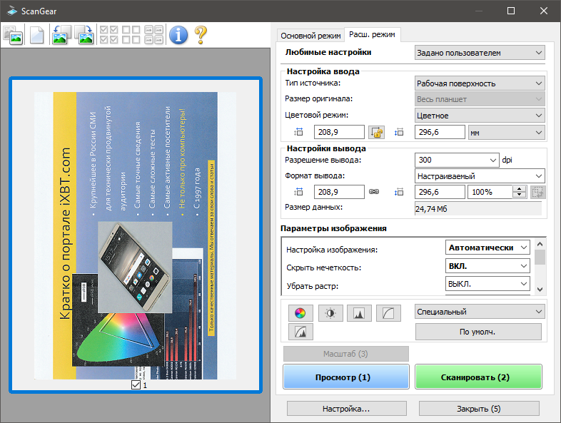 Отключить просмотр эскизов можно в окне, появляющемся по нажатию кнопки «Настройка...» в ScanGear. После этого скан с предельным разрешением получить можно, но будет предупреждение: