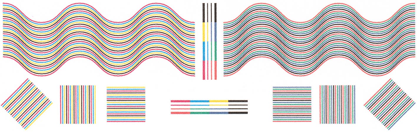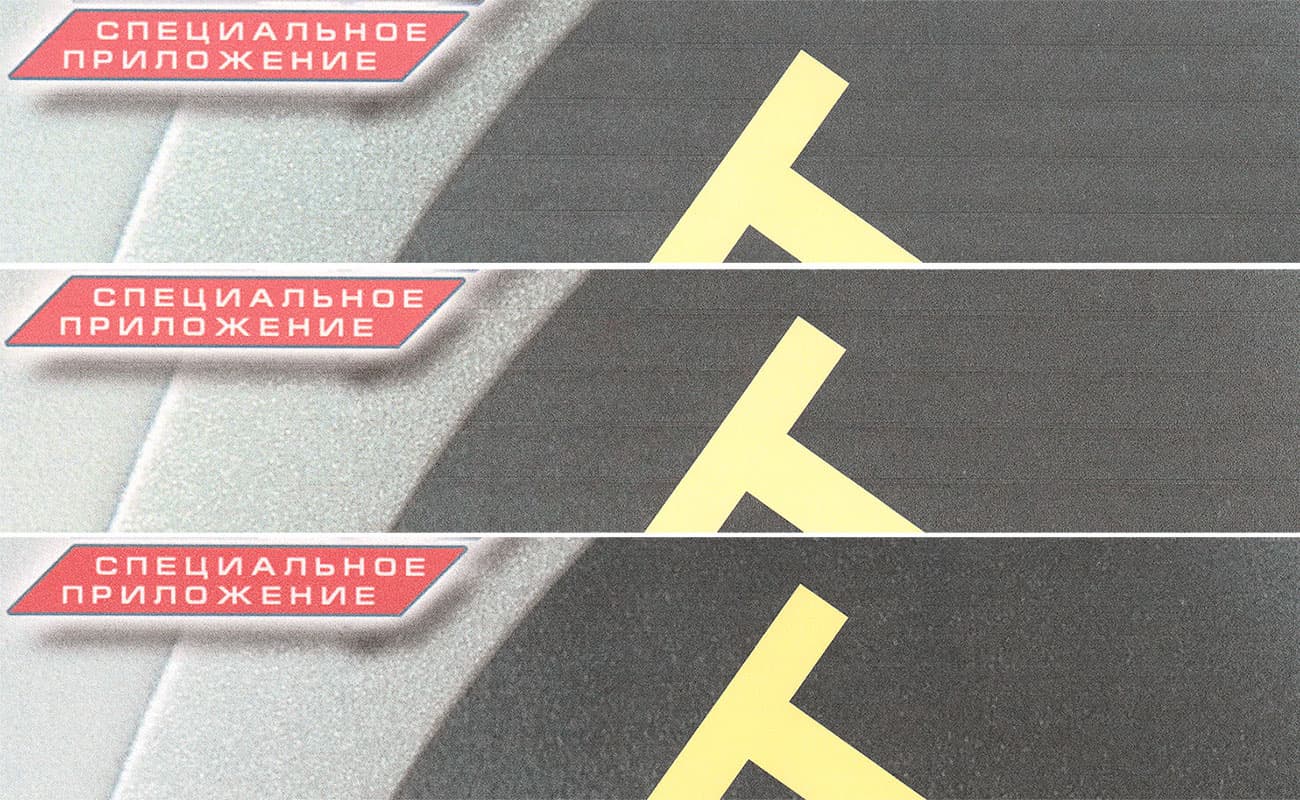 Совмещение цветов по вертикали и по горизонтали очень точное, тонкие линии воспроизводятся хорошо, без заметных даже при увеличении разрывов и ступенек, на тонких изогнутых линиях нет перетеканий и ступенек (конечно, с точностью до пористой структуры бумаги, которая сказывается на таких мелких деталях).