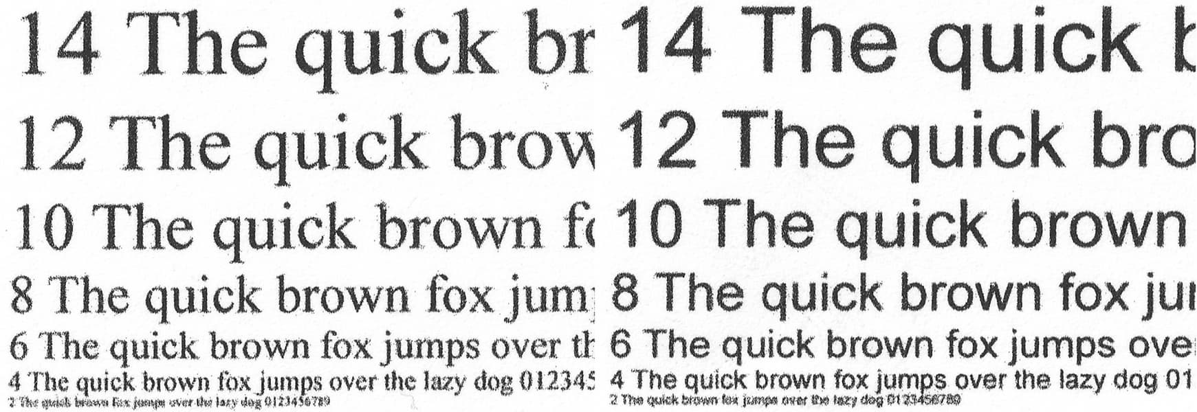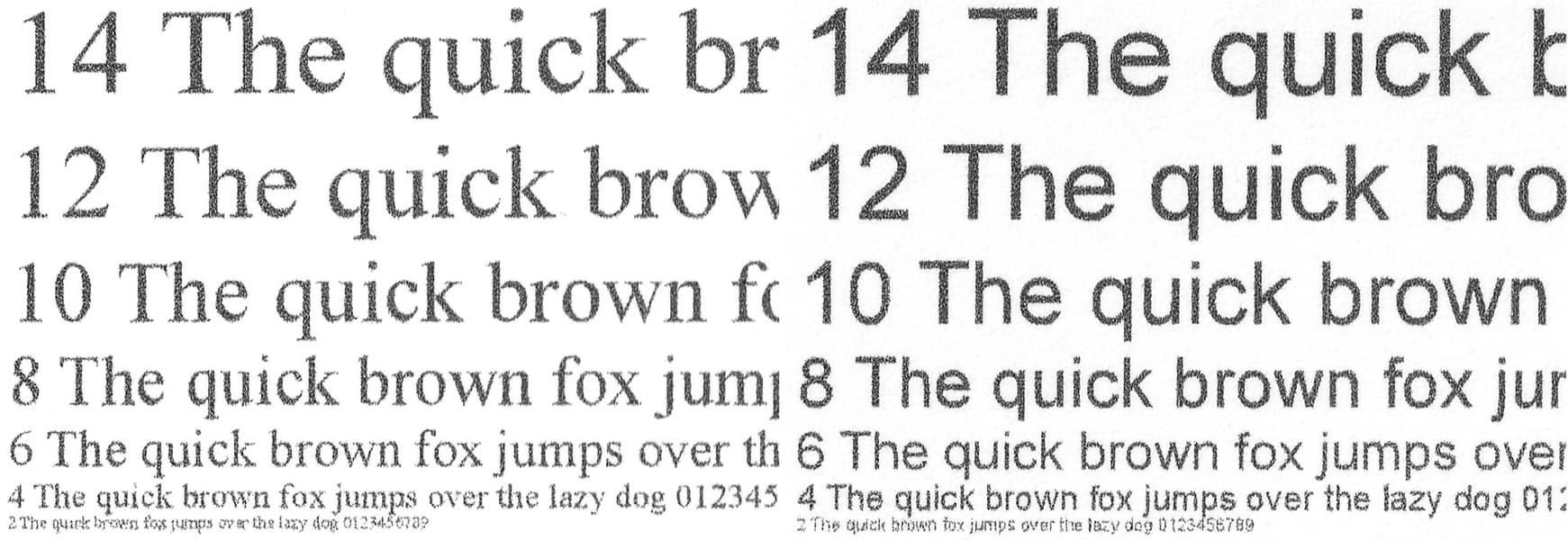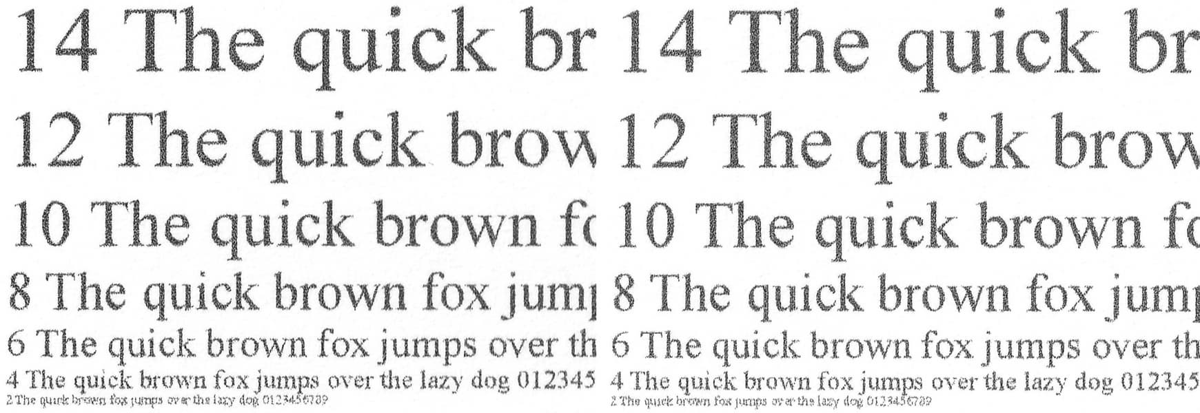 Сделанные с отпечатка, на котором отчетливо читаются шрифты 2-го кегля, копии получаются весьма неплохо: при любой установке качества 4-й кегль без засечек читается нормально, с засечками не столь уверенно, заливки достаточно плотные, контуры букв ровные, хотя при увеличении можно заметить белые точки и другие искажения. При высоком качестве можно (хоть и с трудом) разобрать 2-й кегль без засечек.