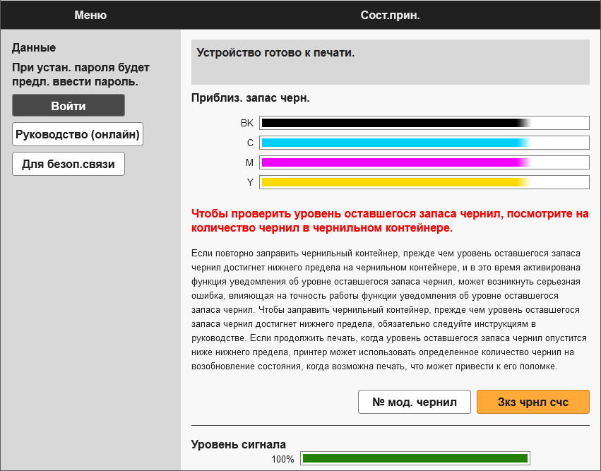 | Ресурс одной бутылочки с чернилами | черная 6000 страниц А4 цветные 7700 страниц А4 цветная фотопечать 10×15: 2200 фото |