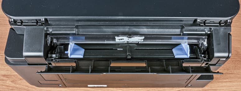 Приемный лоток горизонтальный, выдвижной, он расположен в передней части принтера над подающей кассетой, вместимость в спецификации не упоминается. Этот лоток имеет одну выдвижную часть без боковых и переднего ограничителей, но с откидным элементом, приподнимающим передний край выходящего листа — благодаря ему листы не выскакивают далеко вперед и не падают, хотя и укладываются в лоток не идеально ровно.
