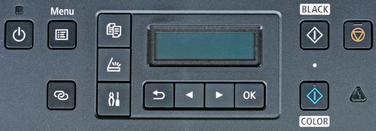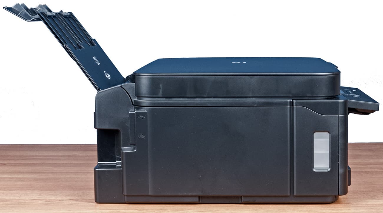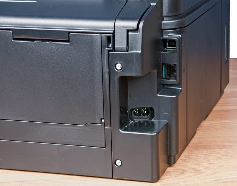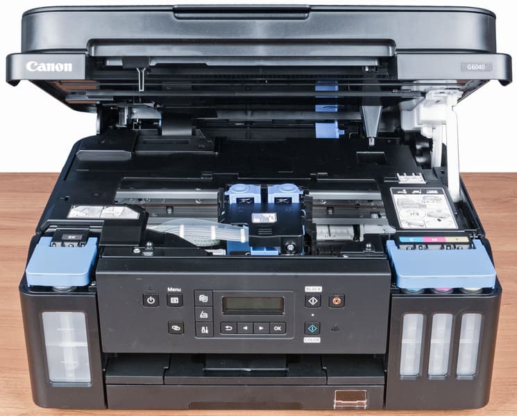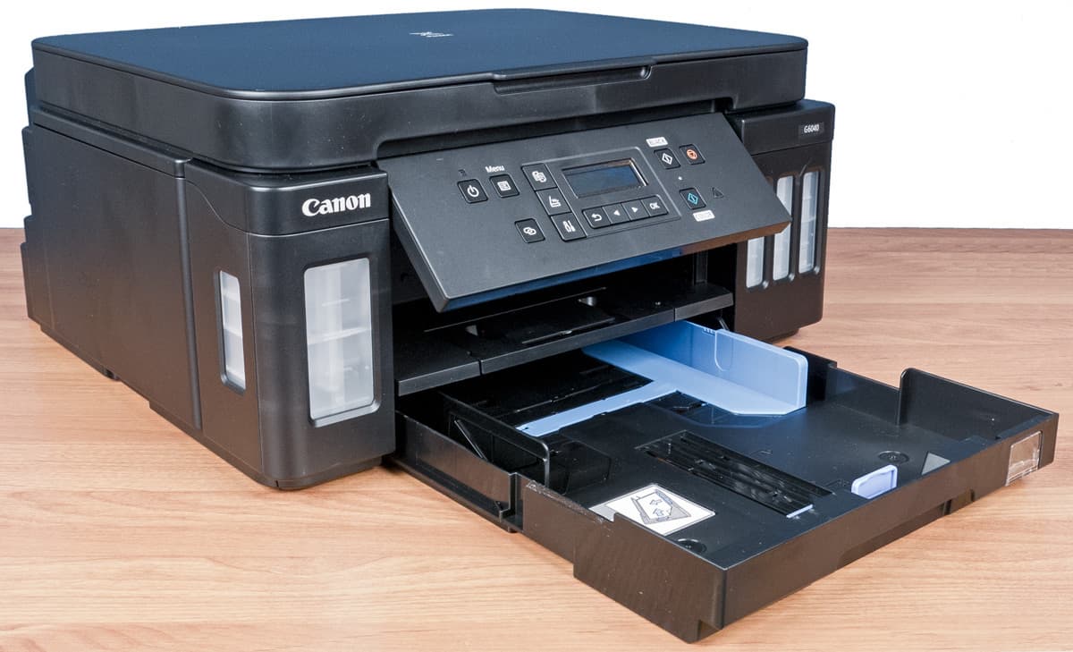 Поскольку при рассмотрении МФУ Canon Pixma G6040 речь идет не только о данной модели, но и о развитии линейки струйных устройств Canon со встроенной СНПЧ, надо отметить существенный прогресс в оснащении по сравнению с известной нам моделью Pixma G3400 (да и промежуточными сериями Gx410/Gx411): появились продвинутая и гораздо более удобная панель управления с ЖК-экраном, а также дуплекс, подающих лотков стало два. В штатном оснащении есть не только USB и Wi-Fi, но также адаптер проводной сети.