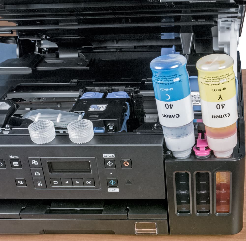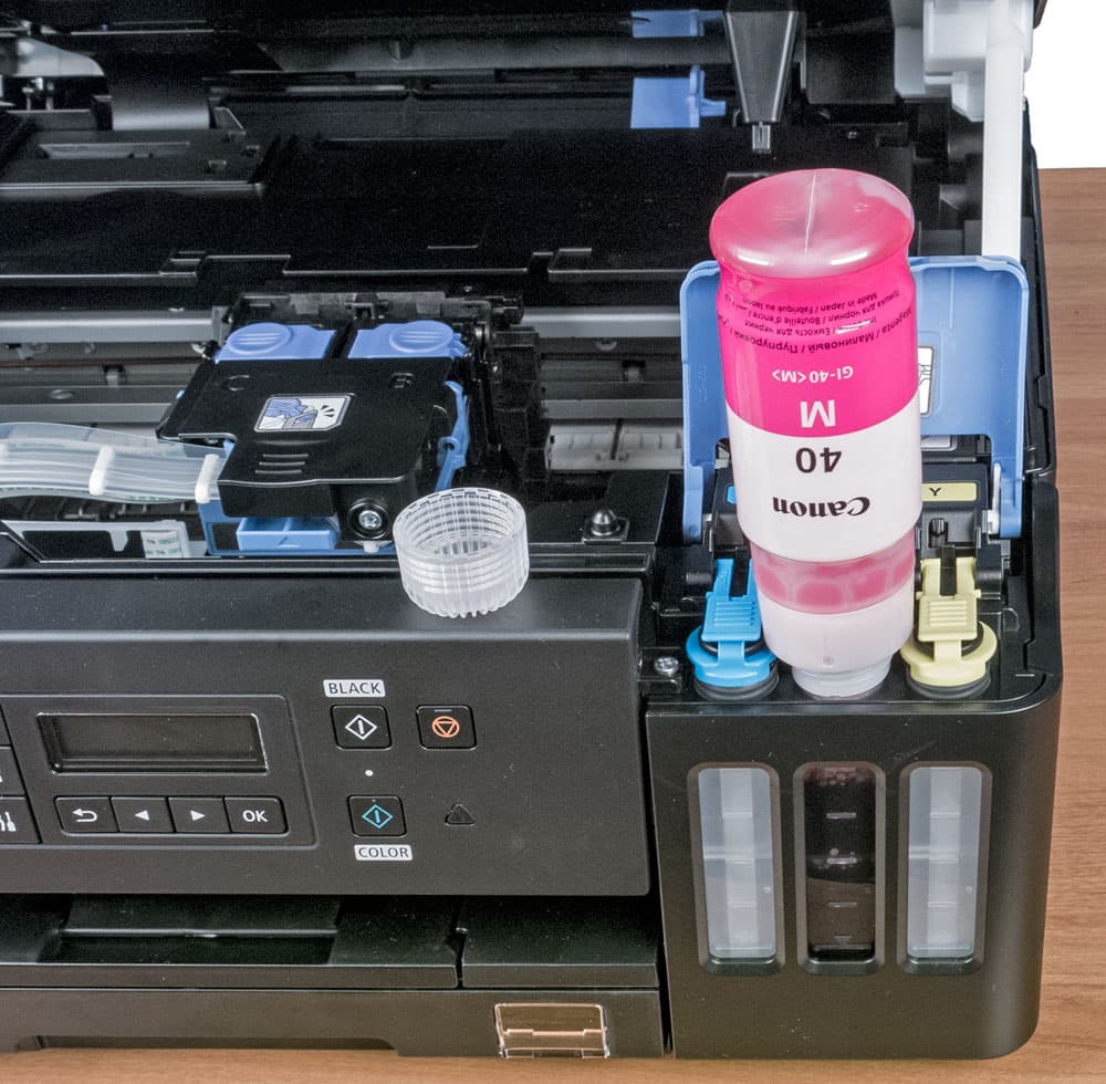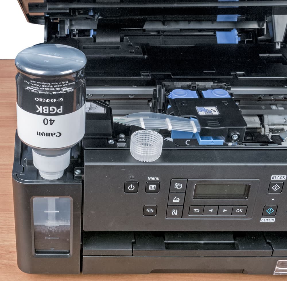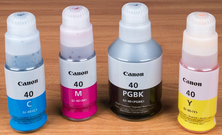 Как и в Pixma G3400, черные чернила пигментные, цветные — водорастворимые. Отличаются ли чем-то сами чернила для G6040 и G3400, сказать трудно, но контейнеры-бутылочки немного разные, и с разными обозначениями: соответственно GI-40 и GI-490. При сравнении заявленных ресурсов печати возникает недоумение: для черного получается, что и GI-40 PGBK, и GI-490 PGBK рассчитаны на 6 тысяч отпечатков, однако объем у них существенно разный: 170 и 135 мл соответственно. А у цветных наоборот: объем одинаковый, по 70 мл, но для GI-40 C,M,Y заявлен ресурс 7700 отпечатков, а для GI-490 C,M,Y — 7000. Скорее всего, для новой модели просто использована иная методика подсчета.