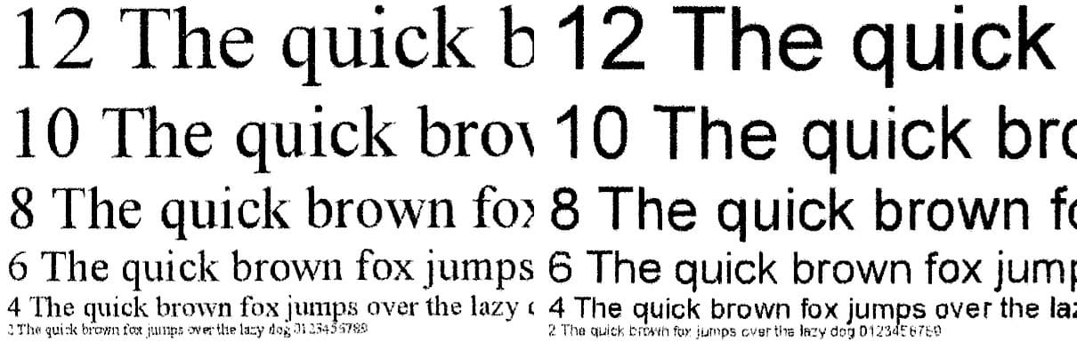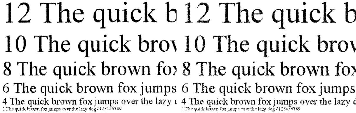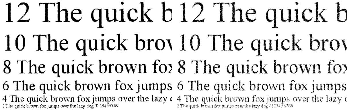 Сделанные с отпечатка, на котором отчетливо читаются шрифты 2-го кегля, копии получаются весьма неплохо: 4-й кегль без засечек читается нормально, с засечками — не столь уверенно, заливки достаточно плотные, контуры букв ровные, хотя при увеличении можно заметить белые точки и другие искажения.
