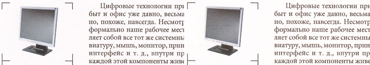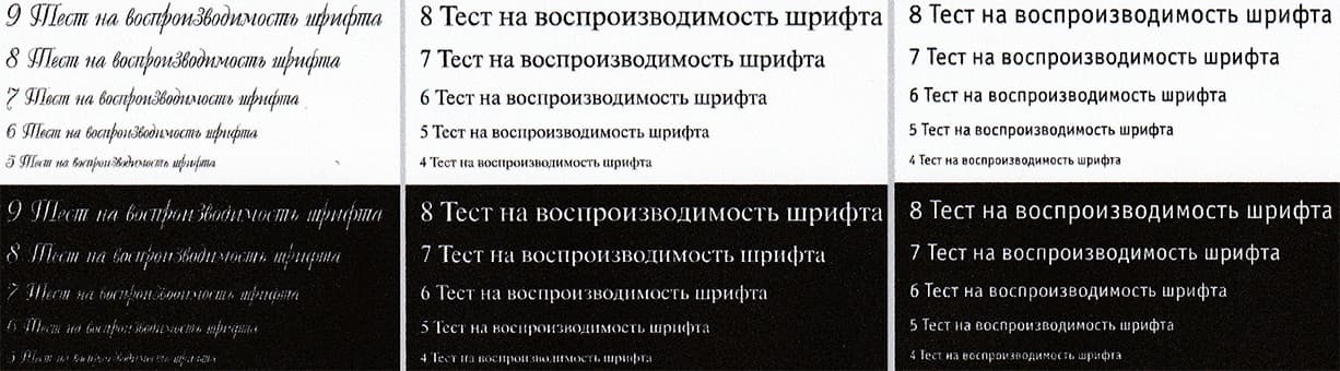 Текстовые поля воспроизводятся посредственно: при нормальной печати шрифты с засечками и без читаются от 4-го кегля, вывороткой — без засечек от 5-го, с засечками от 6-го кегля. Декоративный шрифт реально читается с кеглем от 7-го нормальный, а вывороткой даже 9-й кегль читается с трудом.