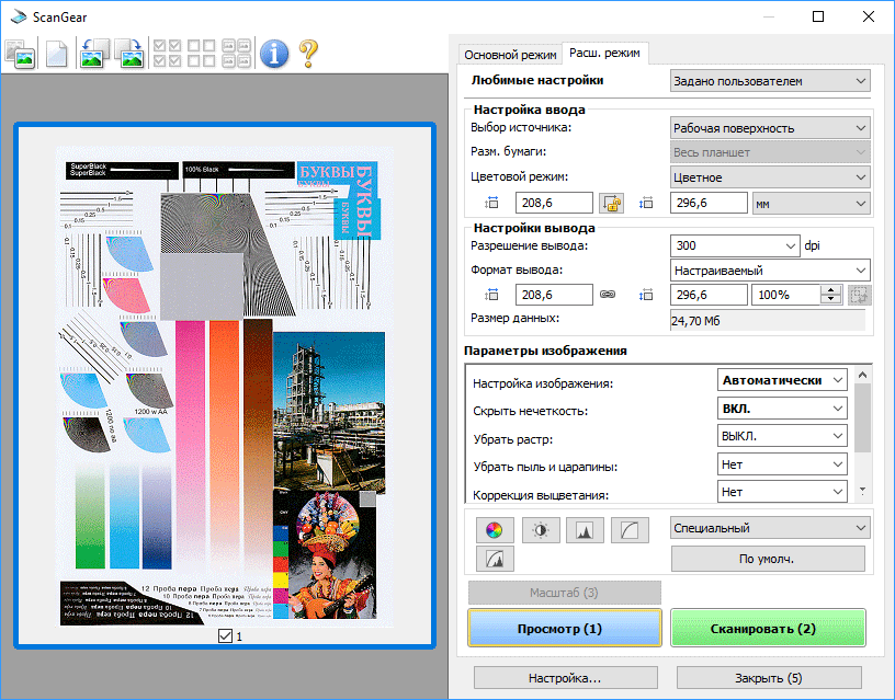Поскольку автоподатчика в МФУ нет, вариант для сканирования единственный — со стекла. Его мы опробовали при разных вариантах подключения, замер времени — от нажатия кнопки «Сканировать» в ScanGear до появления скана в окне приложения, различные улучшения средствами драйвера отключены.
