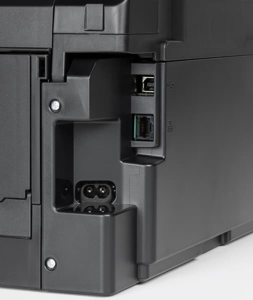 Подающих лотков два, задний рассчитан на 100 листов (здесь и далее с плотностью 80 г/м², если не указано иное), в рабочем положении его наружная крышка откидывается назад, лоток выдвигается вверх и фиксируется под углом около 45 градусов от вертикали. Имеются боковые ограничители для выравнивания стопки бумаги, на них предусмотрены отметки максимального уровня загрузки.