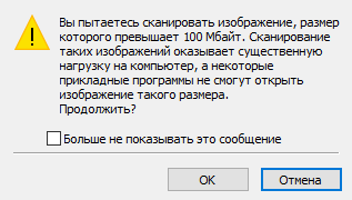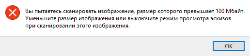 При попытке установить разрешение 1200 dpi (в цвете и в оттенках серого) результирующий размер данных превышает 100 мегабайт, и вместо сканирования лишь появляется такое сообщение: