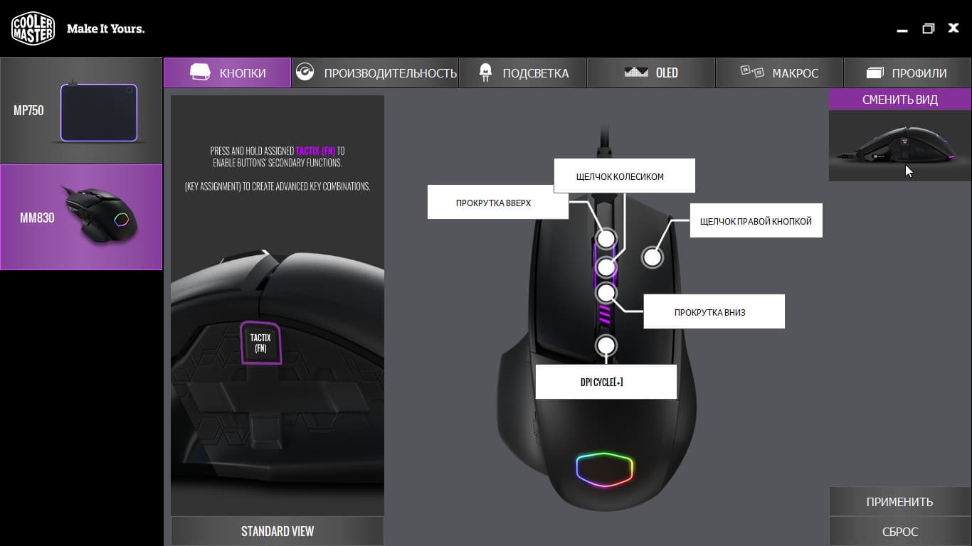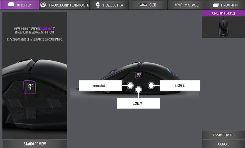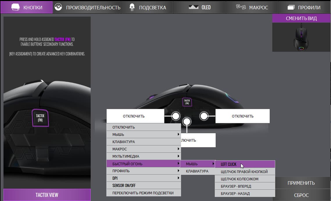 Например, в настройках кнопок при назначении им пользовательских функций нужно помнить, что мышка поддерживает два режима работы: стандартный и тактический. Переход из одного режима в другой осуществляется верхней боковой кнопкой Tactix (Fn). Таким образом, количество команд, присваиваемых кнопкам мыши, можно умножать на два: первый набор функций работает в стандартном режиме, а при переключении в тактический начинает работать второй набор команд.