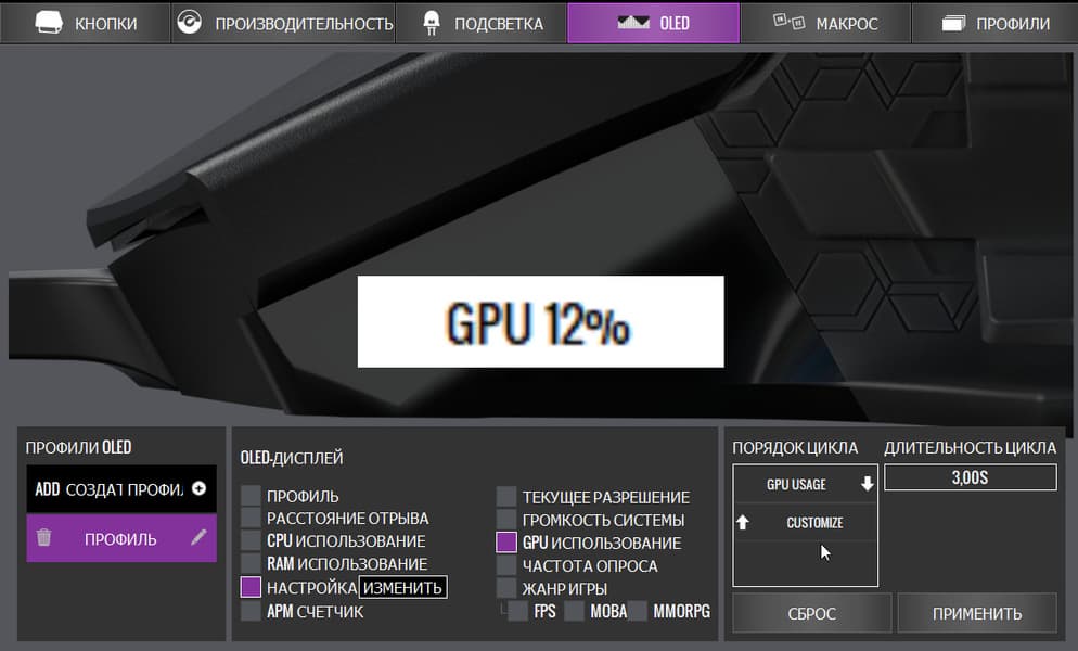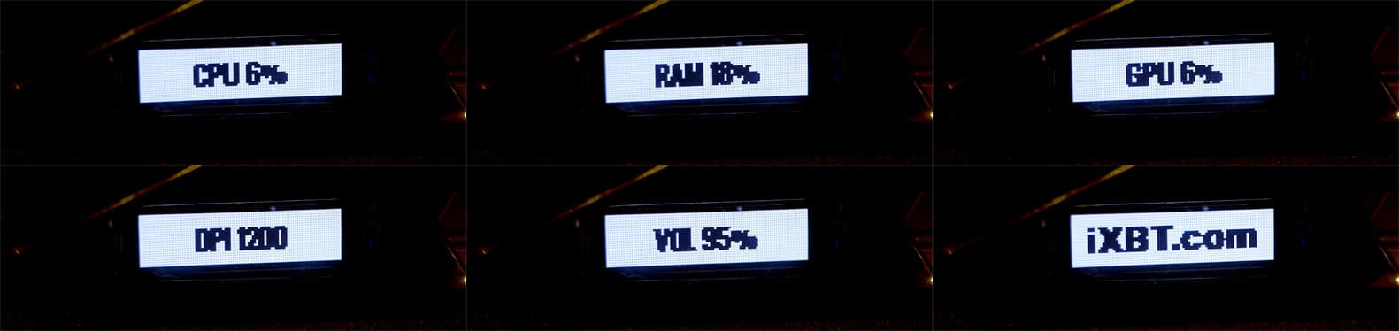 Следующая вкладка отвечает за информацию, которая отображается на встроенном OLED-дисплейчике мышки. В списке доступных присутствуют название профиля, под которым в данный момент работает мышь, процент загрузки центрального и графического процессоров, использование оперативной памяти, текущая громкость динамиков и другие параметры. Выбранные пункты выстраиваются в редактируемую очередь и будут отображаться на дисплее попеременно с заданным интервалом.