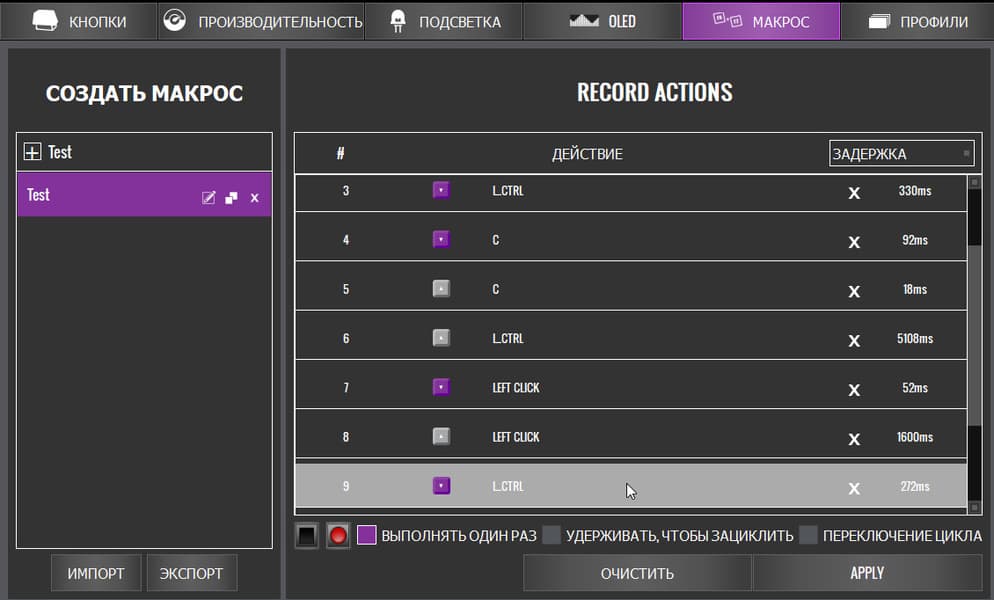 Назначение вкладки Макрос понятно по ее названию. Здесь записывается последовательность действий с мышью и клавиатурой, которые впоследствии может использоваться как шаблон для многократного частого повторения. Каждое записанное действие, нажатие кнопки или паузы между действиями разрешается отредактировать. Готовый макрос записывается в память мышки и может выполняться по нажатию одной из мышиных кнопок.