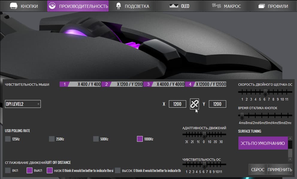 После создания нескольких профилей нам не удалось подметить сколь-нибудь заметные отличия в поведении курсора на разных режимах и поверхностях. Но опытный геймер, чувствующий каждый пиксель, наверняка знает, что почем.