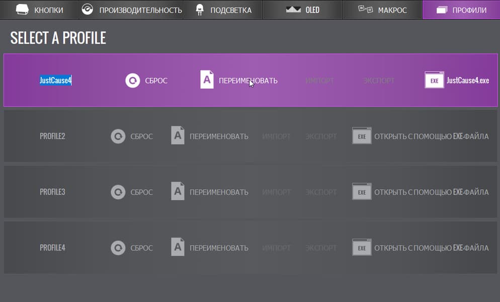 Последняя вкладка Профили предназначена для создания и сохранения разных режимов работы мышки. Напомним, каждый из режимов может содержать свои настройки подсветки, свои команды программных и основных клавиш, свои макросы и настройки чувствительности и поведения курсора. Эти режимы переключаются вручную, также имеется возможность автоматизации. Например, если привязать один из профилей к конкретному приложению (например, к какой-то игре), то при запуске этой игры данный профиль в мышке активируется автоматически.