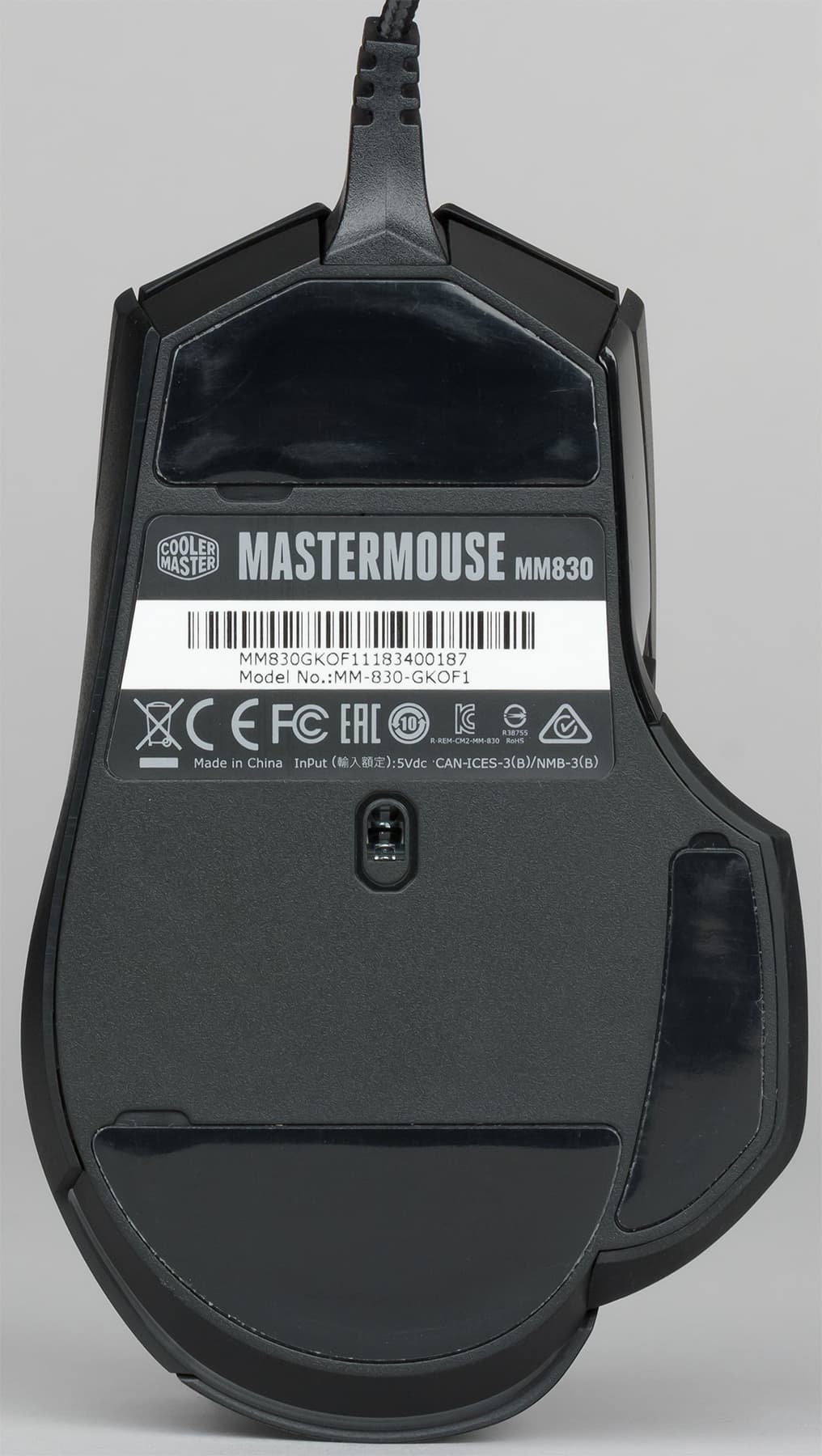 Оптический датчик расположен точно по центру корпуса мышки, ровному движению мыши по поверхности способствуют три скользящих вставки.