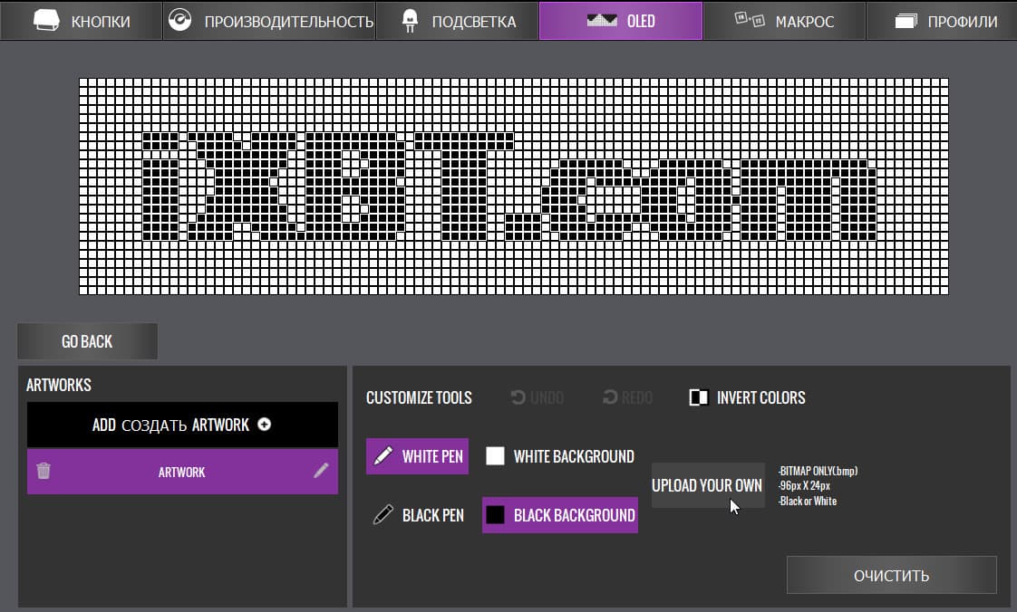 Один из пунктов с именем Настройка открывает дополнительный модуль, в котором с помощью элементарных графических инструментов пользователь может создать свой рисунок. Также разрешается импортировать готовый черно-белый BMP-рисунок с размерами 96×24 пикселей.