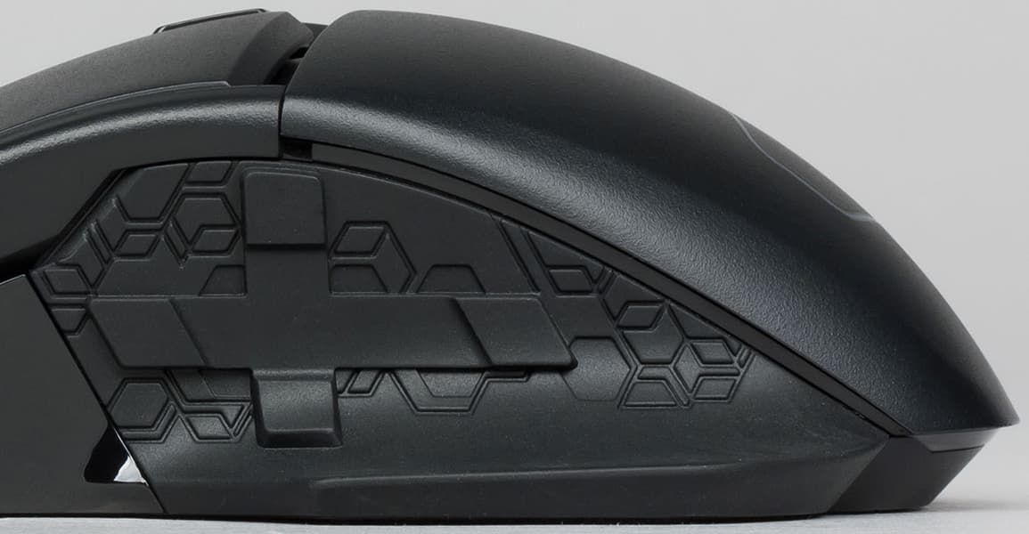 Мышь рассчитана на правшу. На левой стороне ее корпуса имеется рельефная резиновая вставка, которая содержит четыре программируемых кнопки. Кнопки довольно удачно подпадают под большой палец руки средних размеров, хотя для быстрого их нащупывания и эксплуатации поначалу мешает рельефный футуристичный рисунок, выдавленный на этой вставке. Ну, в каждом деле требуется привычка.