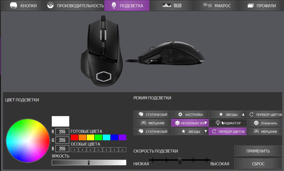 Вкладка Подсветка содержит заготовки поведения мышиного свечения, имеется и настраиваемый пресет. Каждая предустановка имеет свою настройку либо оттенка, либо скорости изменения яркости. При выборе того или иного режима и во время его настройки, в верхней части окна синхронно отрисовывается выбранный эффект. Автору по душе больше всех пришелся режим Перебор цветов со средней скоростью мигания.