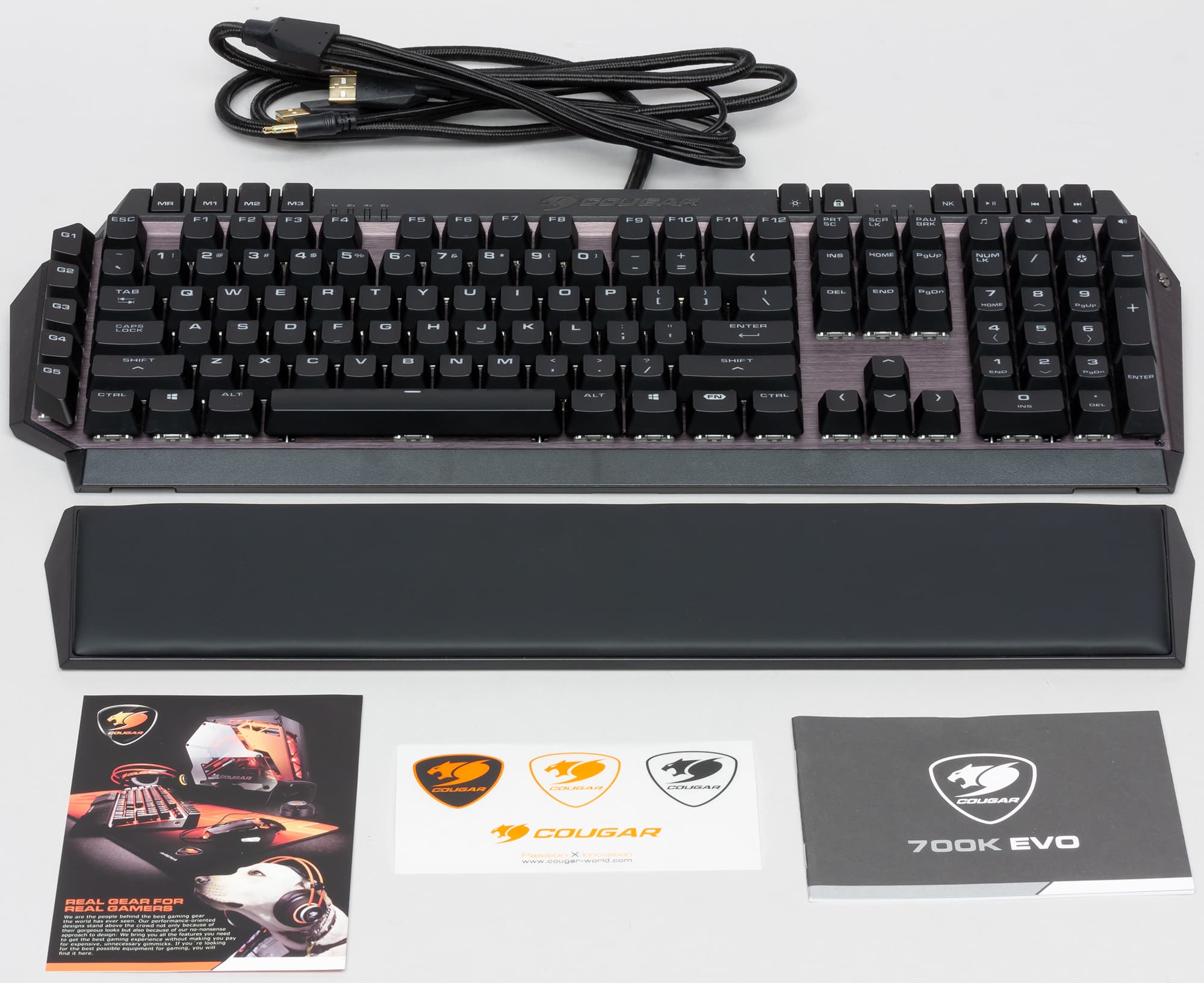 В комплекте с клавиатурой содержится подставка для запястий, краткое руководство пользователя, рекламная листовка и лист с наклейками бренда Cougar.